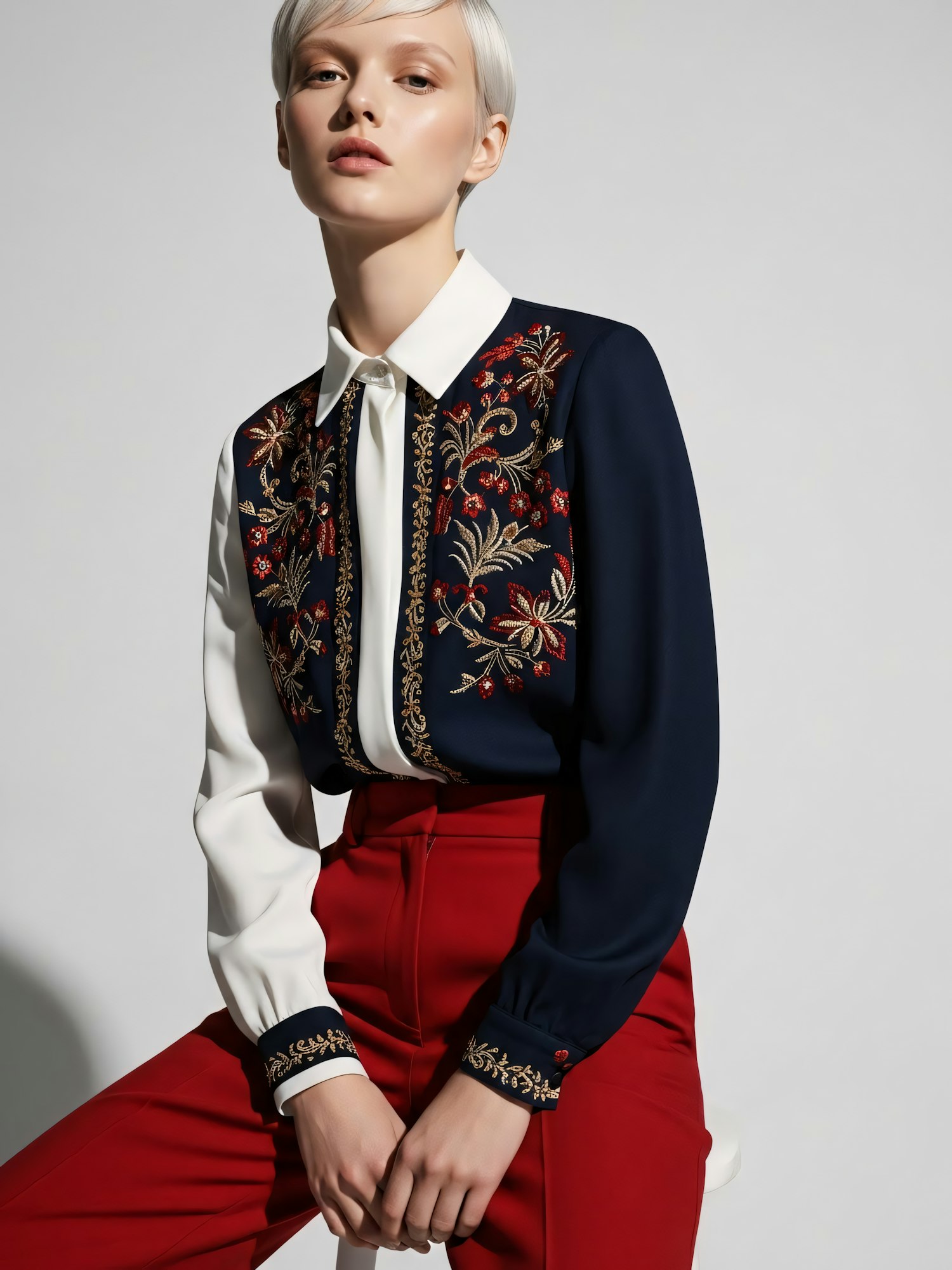 Stylish individual in a navy embroidered blouse and red trousers, showcasing a modern and elegant fashion statement.