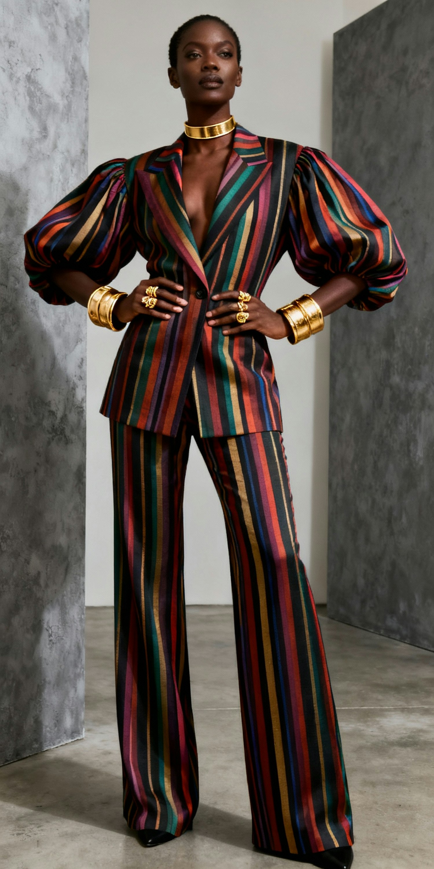 Full-body portrait of a black woman wearing a luxurious, corporate outfit featuring bold, multi-colored vertical stripes. The outfit has a voluminous sleeves, She is accessorized with chunky, statement gold cuff bracelets on both wrists, several gold rings, and a thin gold choker necklace. The pose is confident and elegant, The background is a minimalist composition of textured gray walls and a smooth concrete floor. Soft, even lighting meticulously highlights the rich textures of her garment and the intensity of her expression. The style is cinematic, sharply focused, and exudes an artistic high-fashion vibe that emphasizes her bold presence.