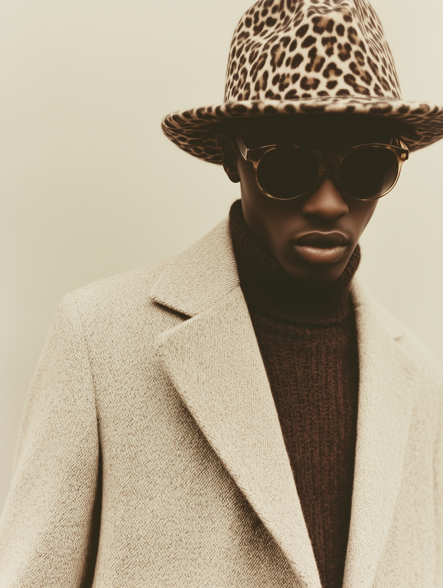 Stylish individual in a beige coat, leopard-print hat, and sunglasses, exuding modern elegance with warm, muted tones.