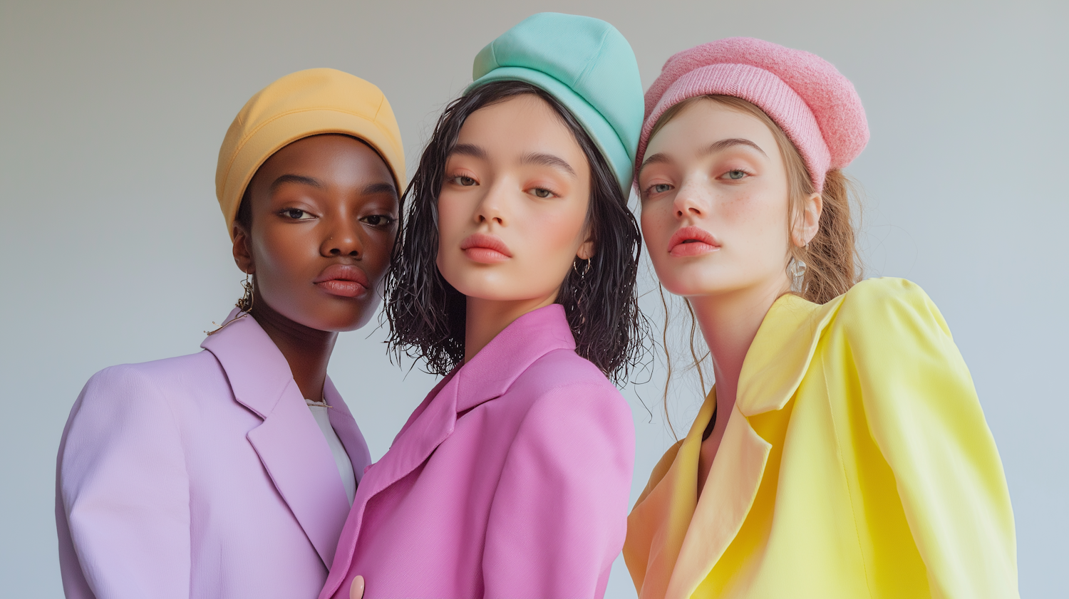 Three stylish women in pastel blazers and berets pose confidently in a minimalistic setting, showcasing vibrant fashion and diversity.
