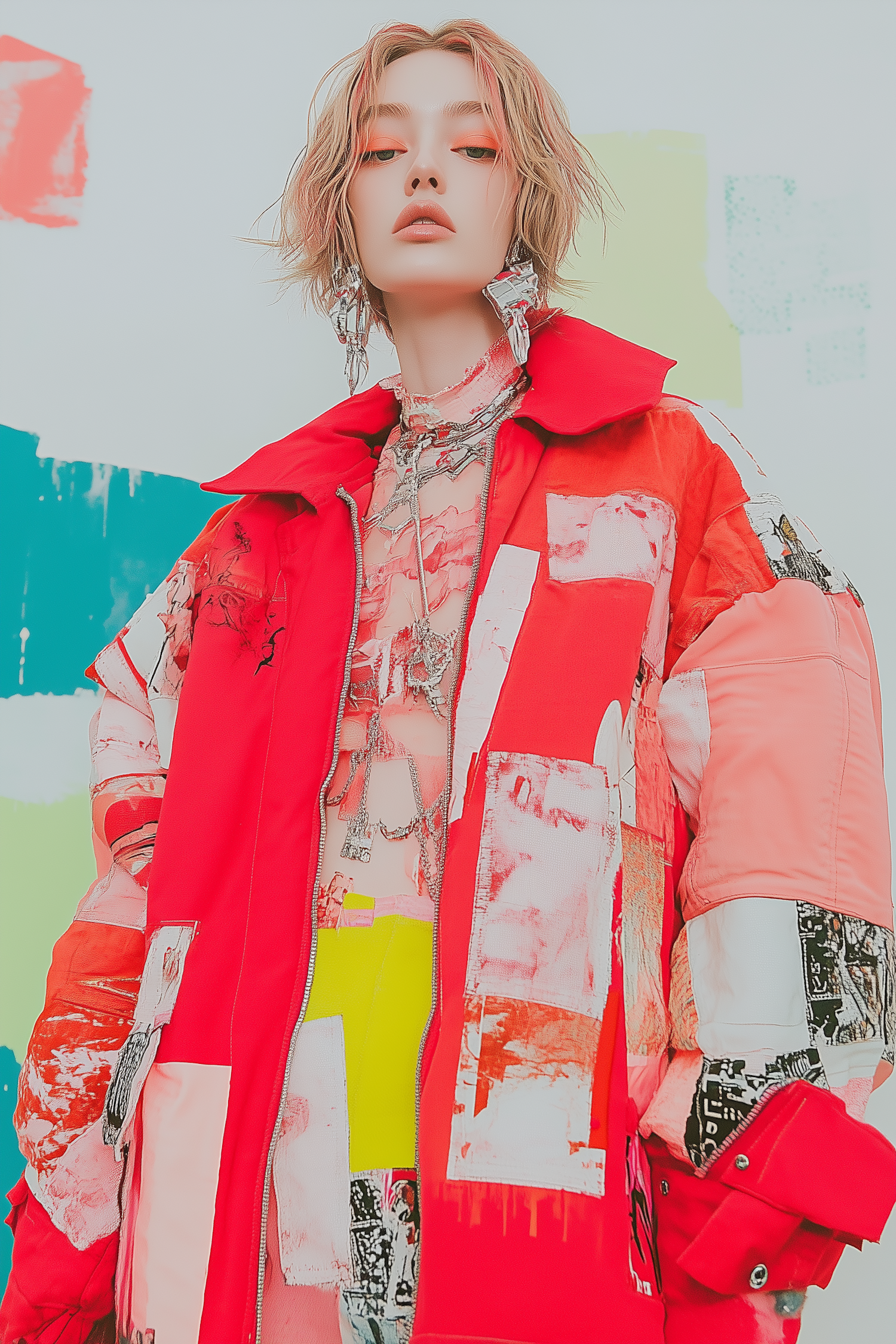 Fashion-forward look with a red patchwork jacket, bold orange eyeshadow, and layered silver accessories against a pastel abstract backdrop.