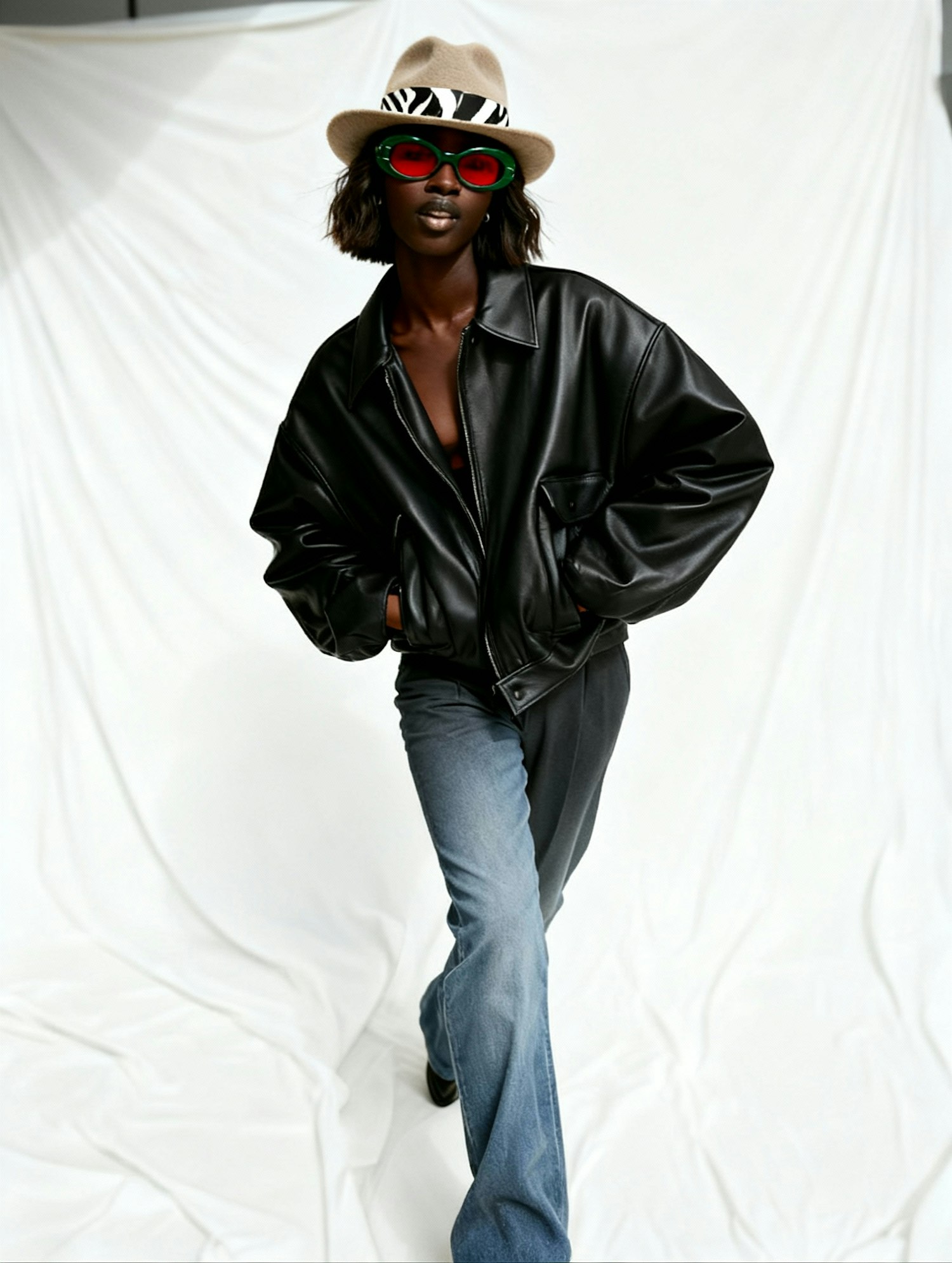 A fashionable person in a leather jacket, jeans, and a hat with zebra accents poses confidently with bold red sunglasses.