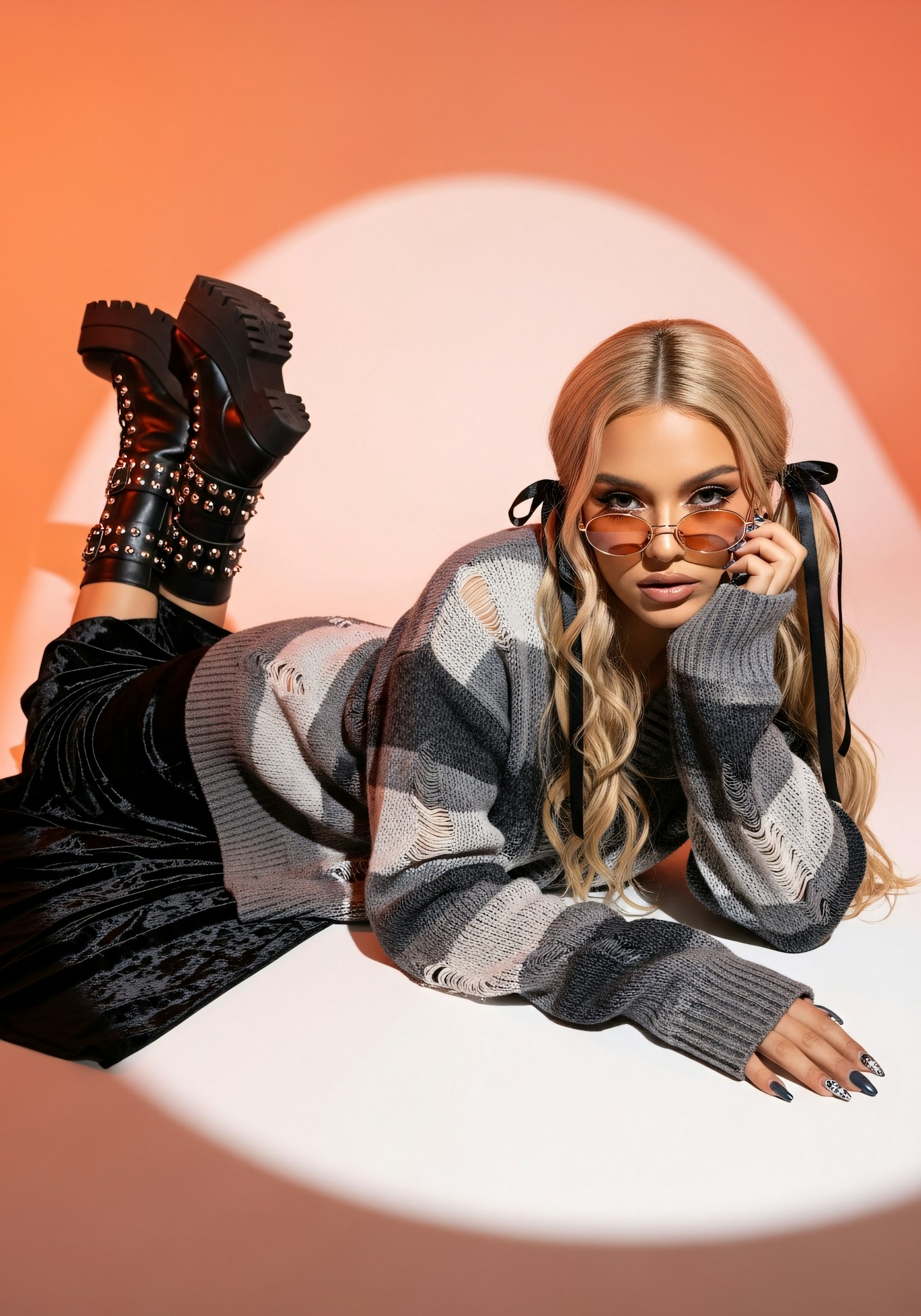 A fashionable person in a gray sweater and black boots poses on a white surface with an orange background, showcasing a chic style.