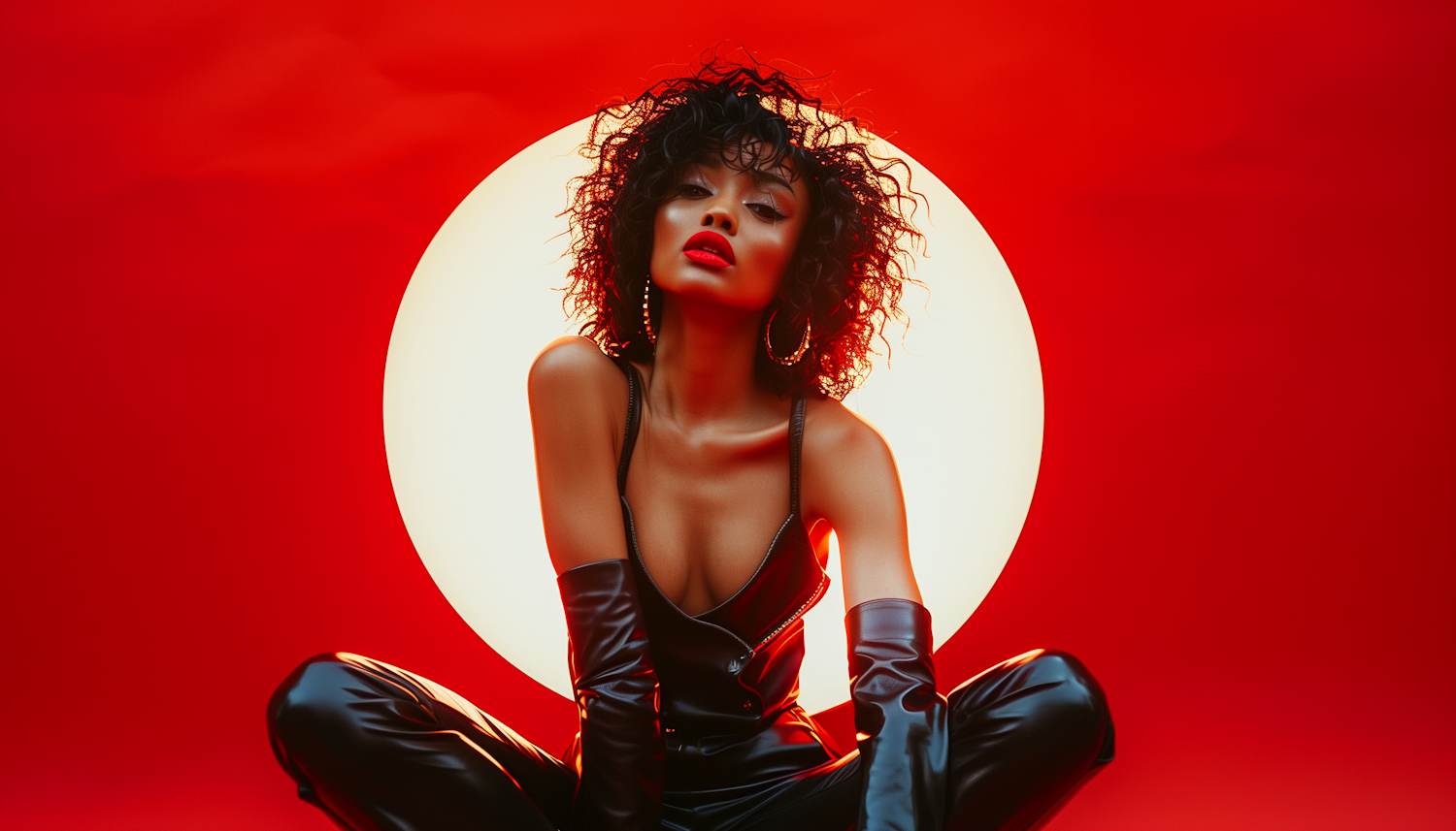 Woman in black leather outfit against a vibrant red background, with curly hair and bold red lipstick, exuding confidence and style.