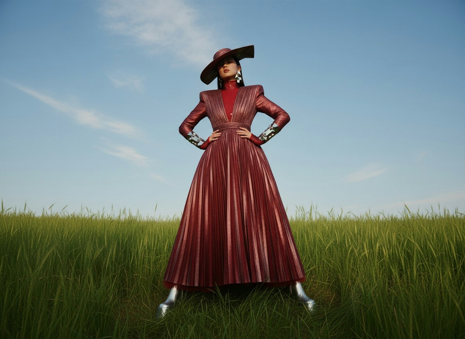 A person in a pleated red dress and wide-brimmed hat stands confidently in a grassy field under a clear blue sky.