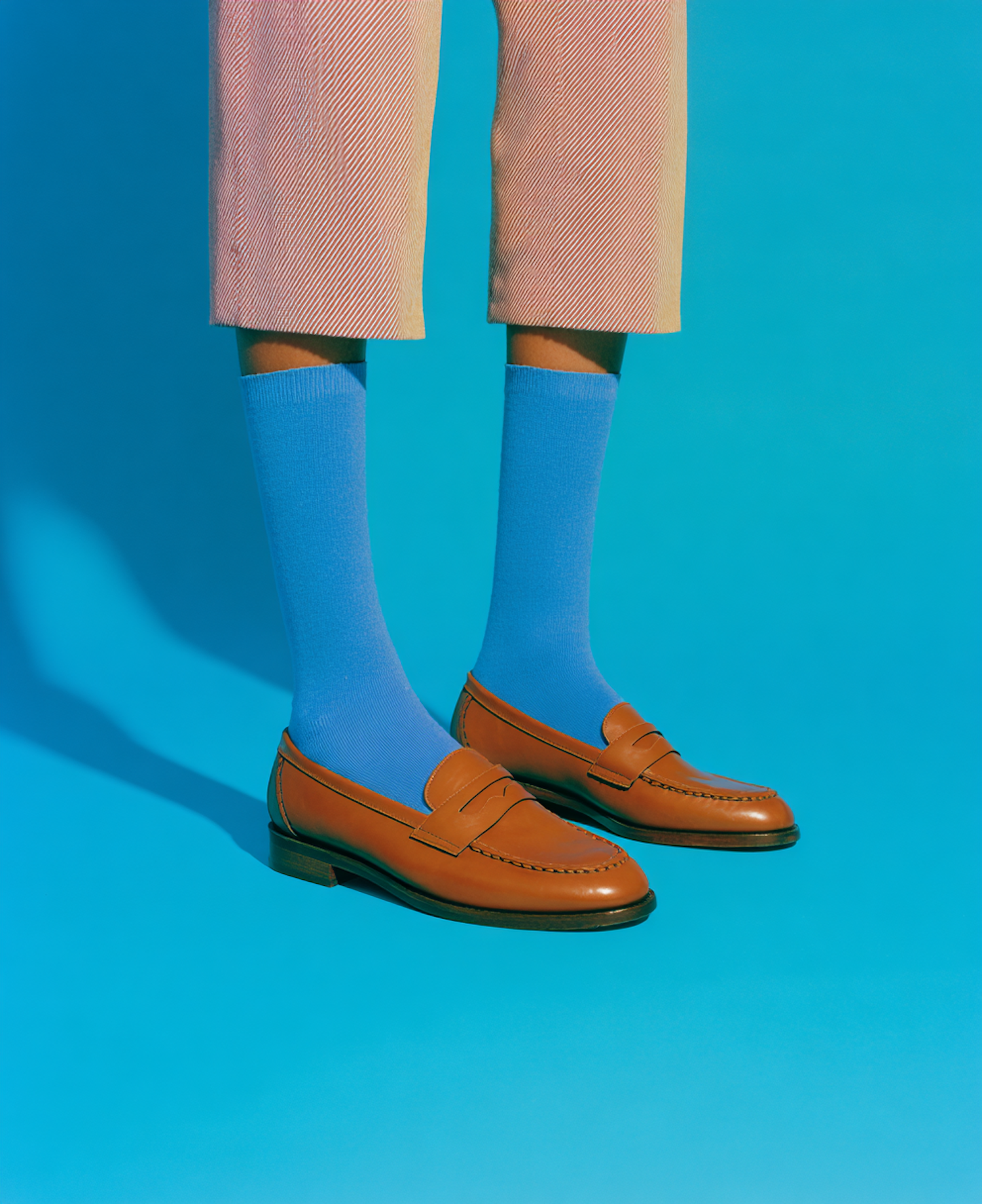 Stylish brown loafers paired with bright blue socks and light pink cropped pants against a vibrant blue background.