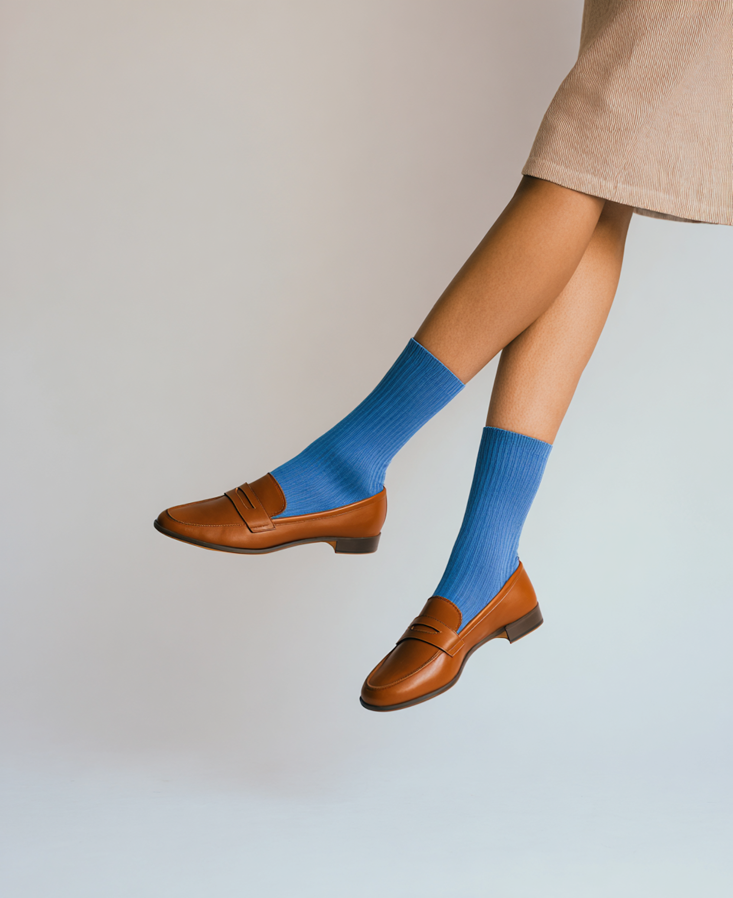 Stylish brown loafers paired with vibrant blue socks and a beige skirt, set against a clean, minimalistic background.