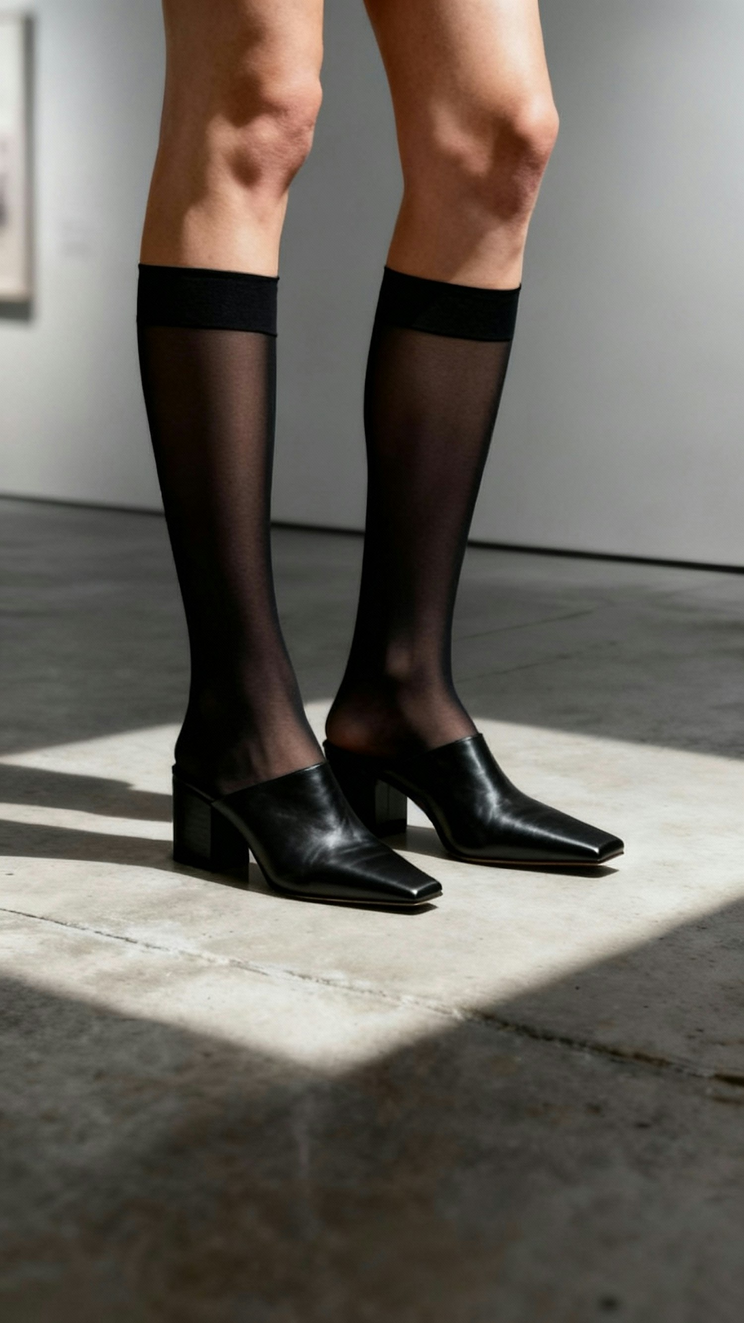 Close-up of legs in black knee-high stockings and stylish black leather heeled mules on a polished concrete floor.