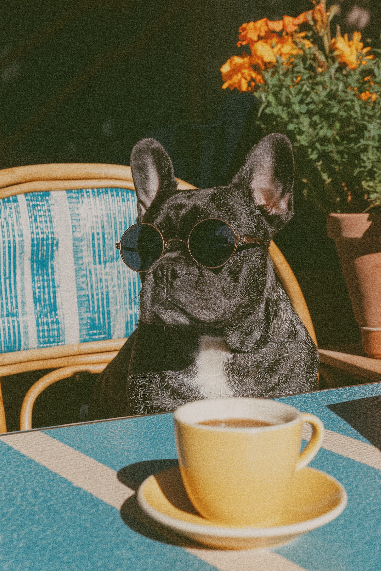A stylish French Bulldog wearing sunglasses sits by a table with a yellow cup, surrounded by vibrant flowers and sunny vibes.