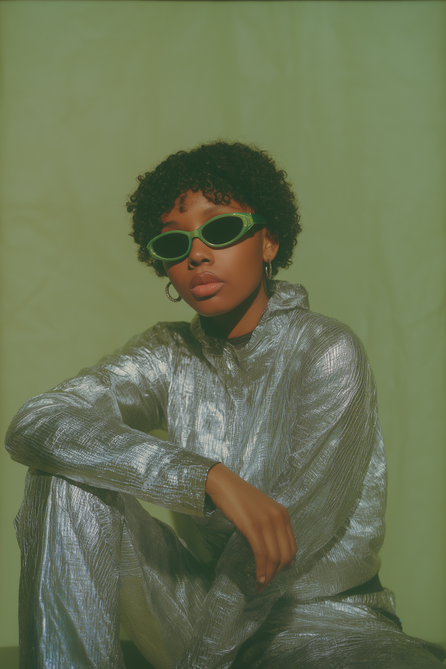 Stylish individual in a shiny silver outfit and green sunglasses, sitting against a green backdrop with a futuristic vibe.