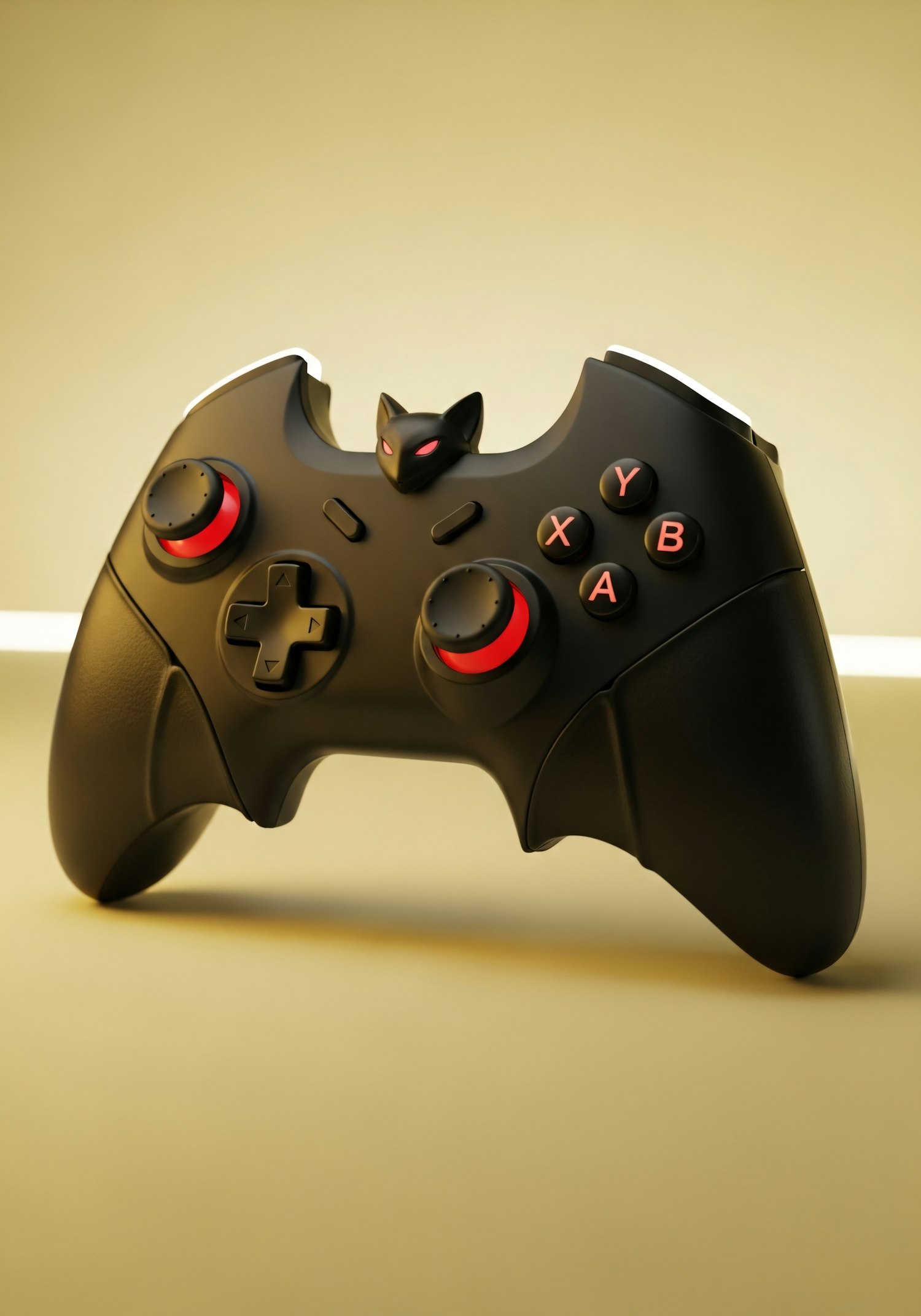 A stylish black gaming controller with red accents and a unique cat emblem, set against a gradient yellow background.