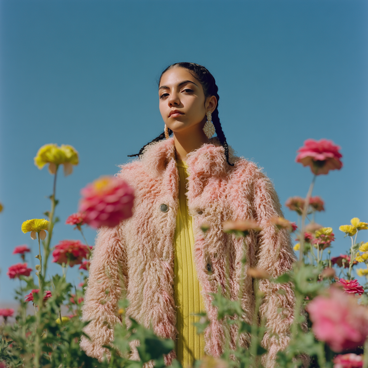 A fashion-focused image featuring a person styled in a pink coat amidst a colorful flower garden, with bright colors and clear, vibrant details.
