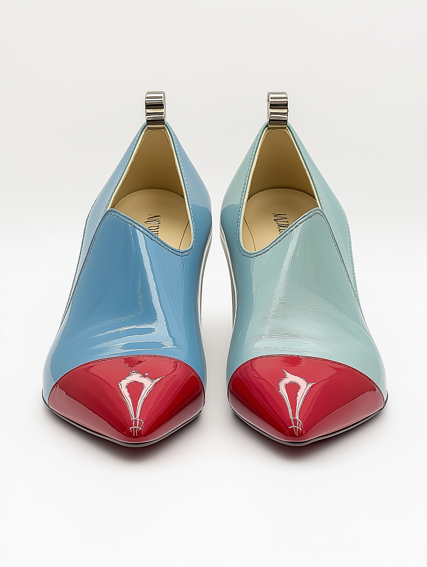 Stylish glossy shoes with red tips, blue and mint green body, and metallic pull tabs. Unique design on a white background.