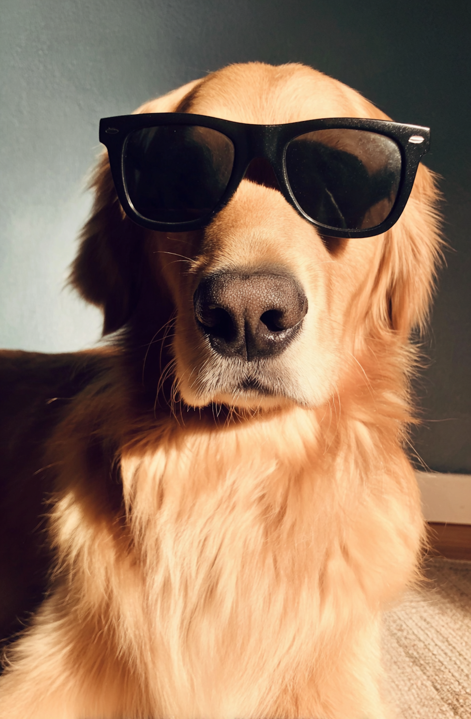 Golden retriever wearing stylish sunglasses, sitting in warm lighting, capturing humor and personality in a charming and unique way.