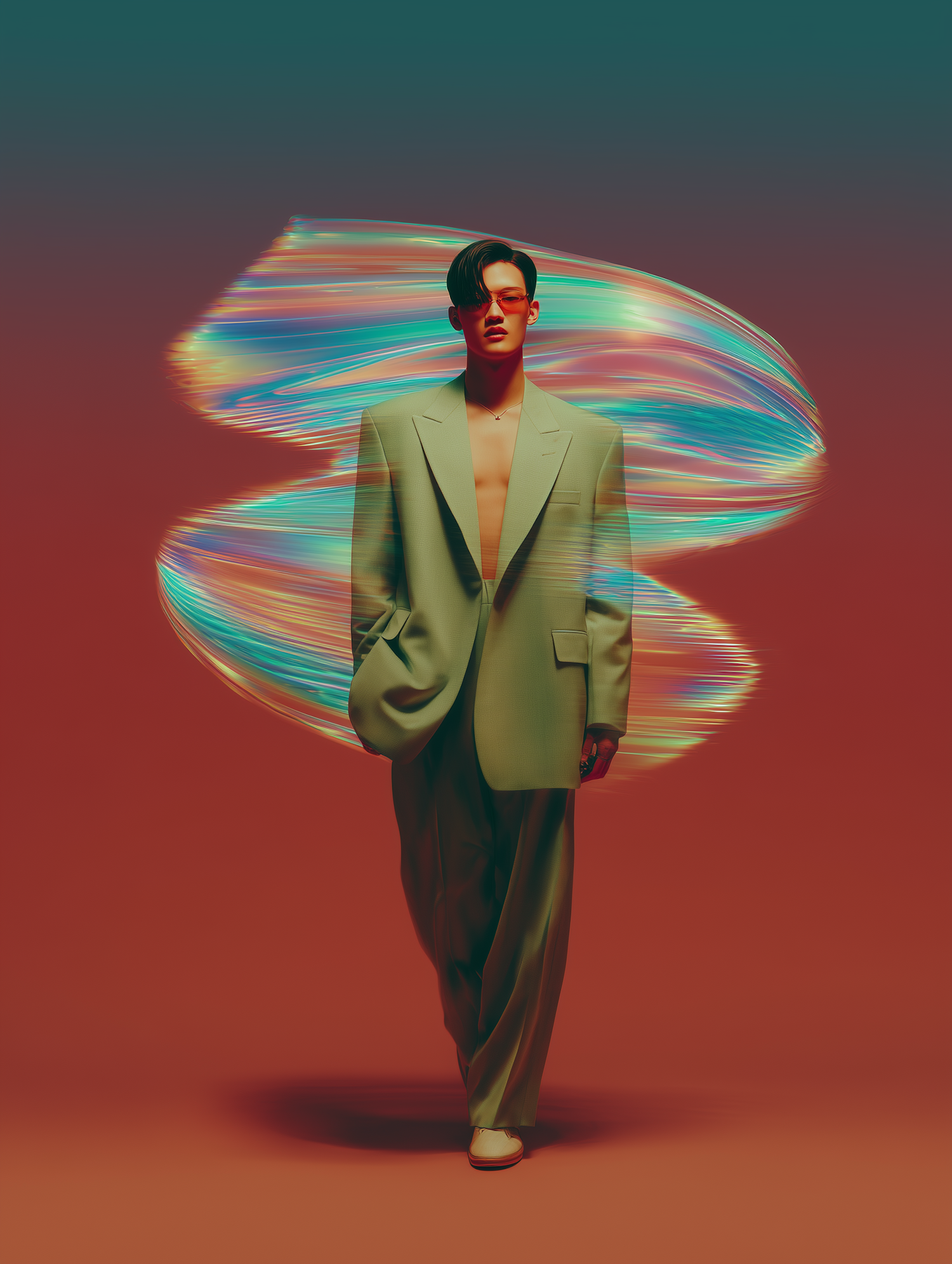 A person in a green suit with tinted glasses stands against a gradient background, with colorful light trails swirling behind them.
