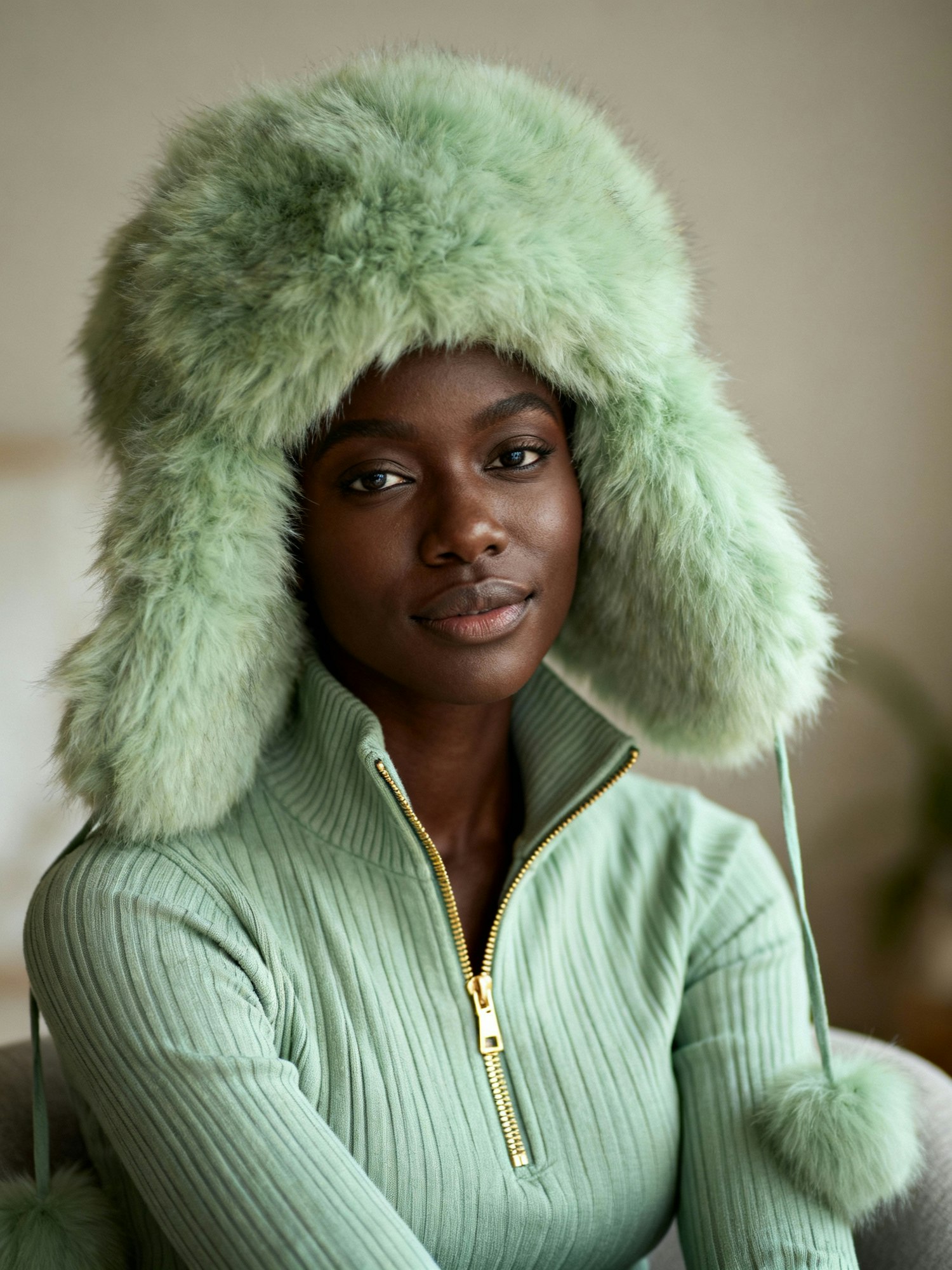 A Black woman in a voluminous light green fluffy fur hat and matching ribbed zip-up top with a high collar and gold zipper. Her serene expression, relaxed eyes, and soft gaze radiate calm confidence. Lighting is ambient and neutral, emphasizing cozy textures in a minimalist setting.