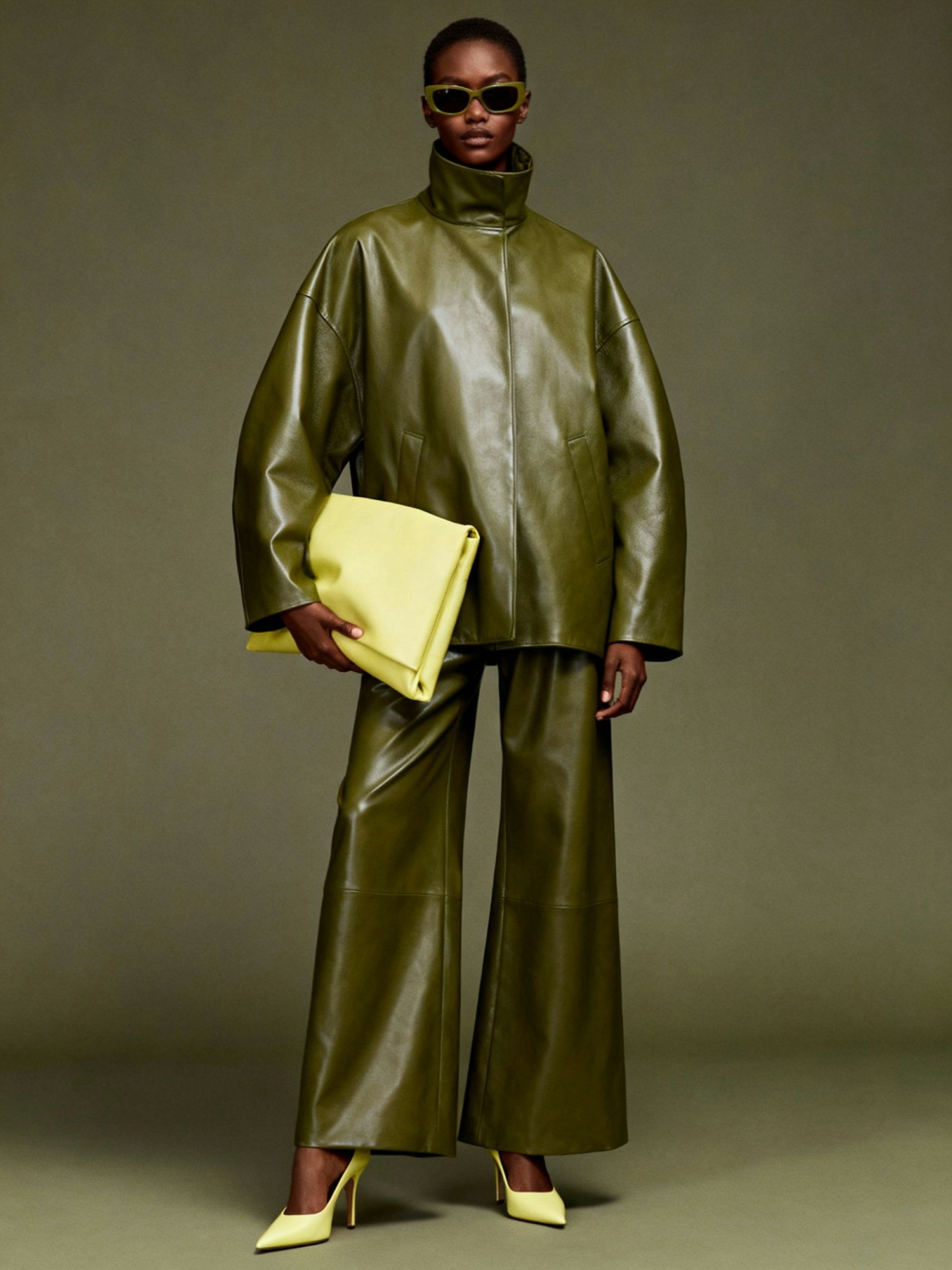 A confident woman standing against a plain muted olive-gray background that complements her warm brown skin tone and the sleek tones of her outfit. She wears a high-neck oversized olive green leather jacket with a glossy finish, paired with wide-leg matching leather pants. Accessories include a large pale yellow clutch bag, pointed-toe high heels in pale yellow, and sunglasses. The look blends monochromatic polish, texture contrast, and contemporary elegance in a bold editorial composition