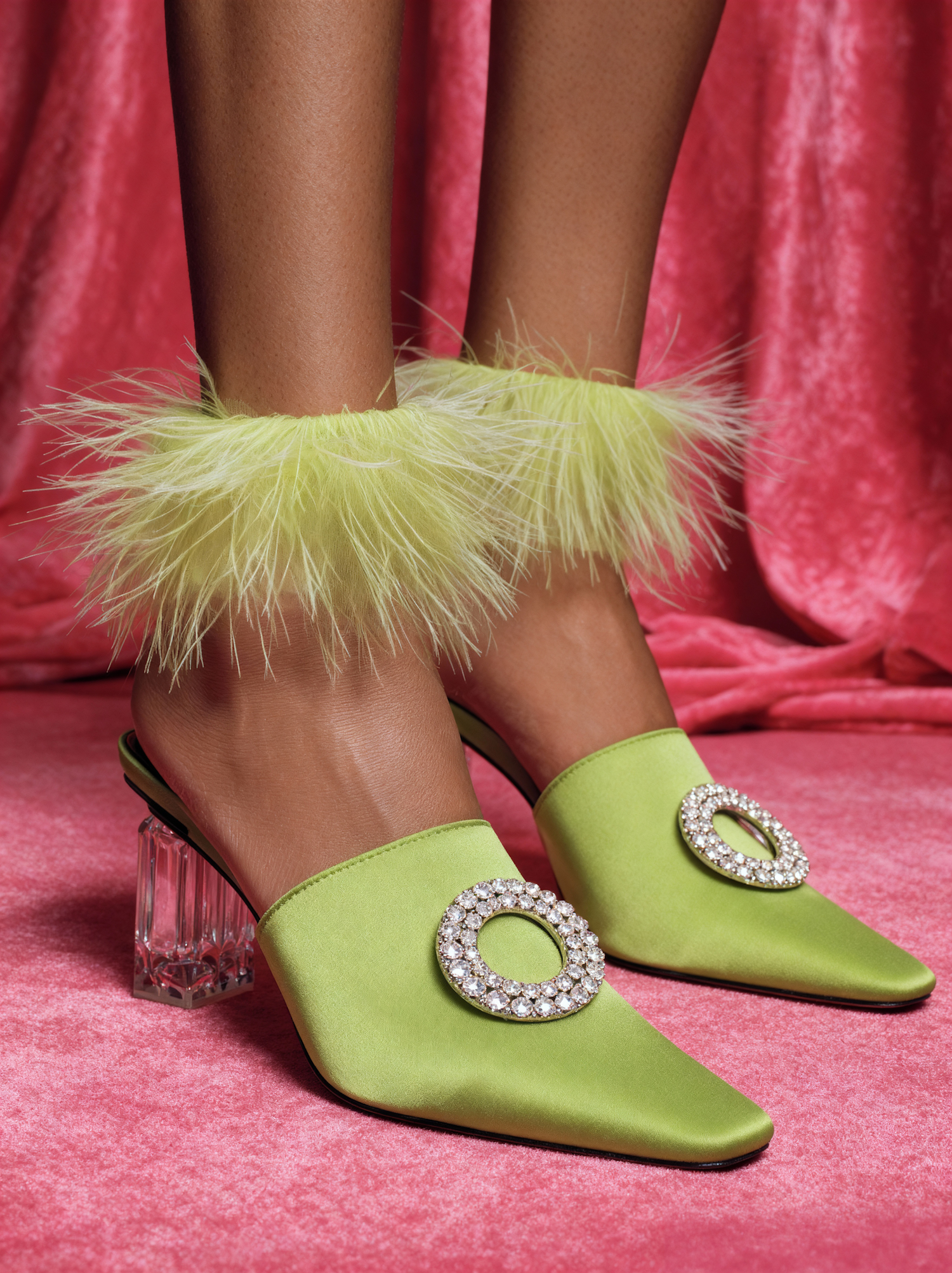 Stylish green satin mules with crystal embellishments and feathered anklets on a pink velvet background.