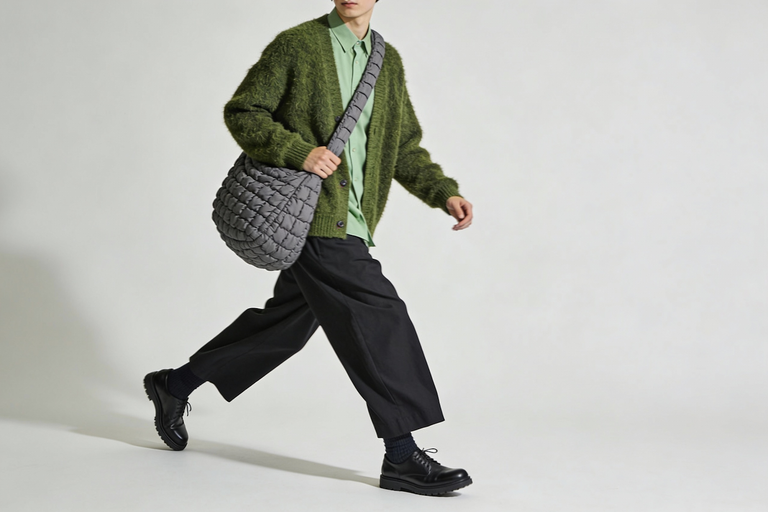 A fashion-forward individual is captured mid-step against a plain light background, dressed in layered garments that blend cozy textures with Scandinavian minimalism. They wear a fuzzy green cardigan over a lighter green shirt, paired with wide-legged dark pants, black shoes, and dark socks. A large textured gray shoulder bag with a thick strap is slung over one shoulder. The lighting is soft and natural, casting gentle shadows that highlight the motion and tactile quality of the fabrics. The composition is editorial and composed, emphasizing tonal layering, clean silhouettes, and quiet confidence in a minimalist setting