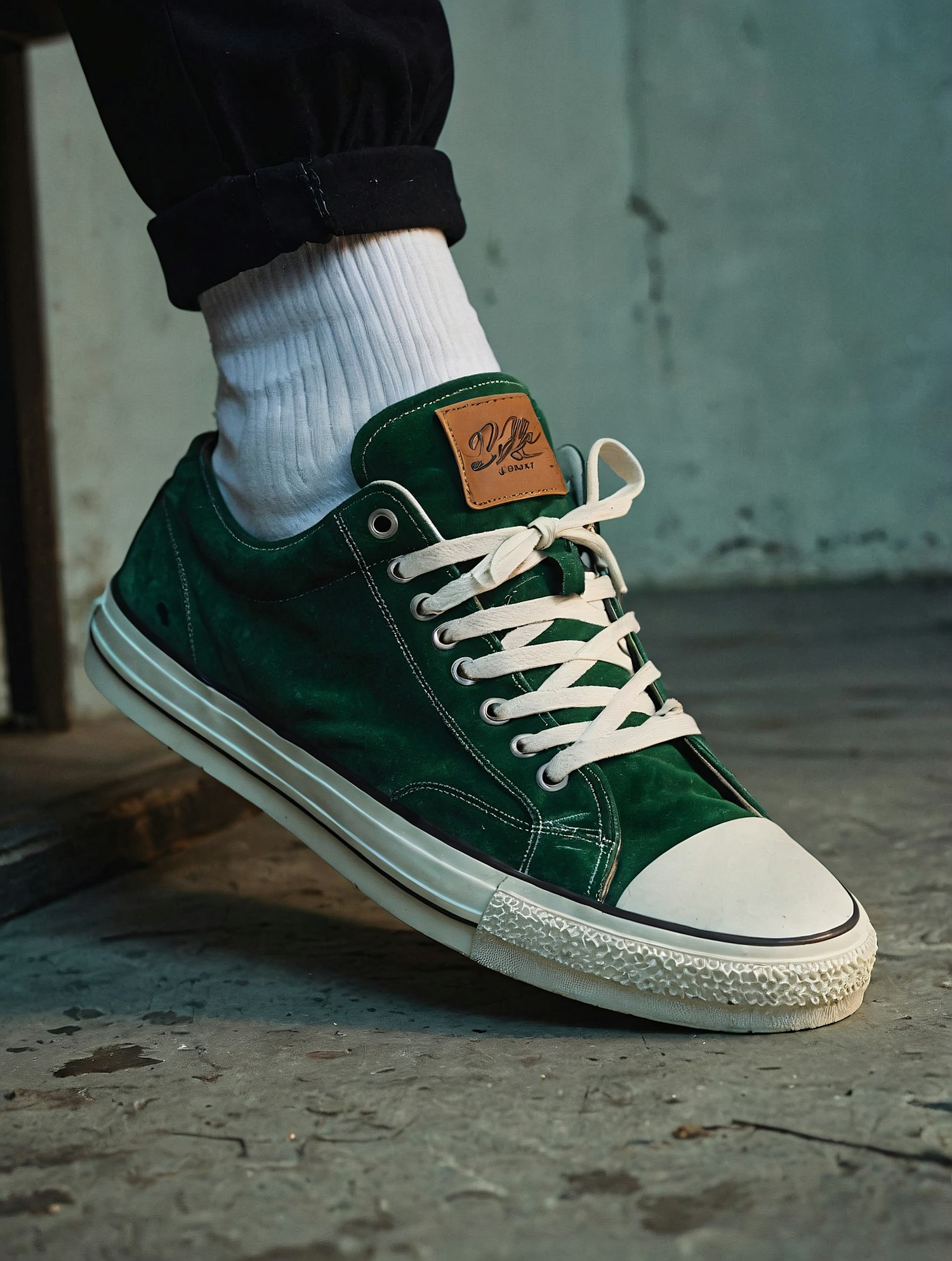 Stylish green sneakers with white laces and a leather logo patch, paired with white socks and black pants on a concrete floor.