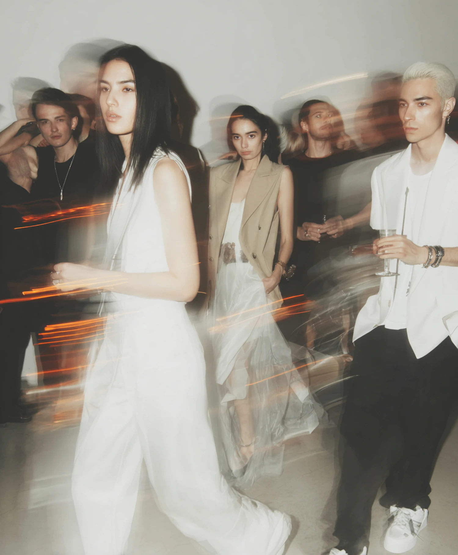 A dynamic photo of stylish individuals at a social event, showcasing modern fashion and a vibrant atmosphere.