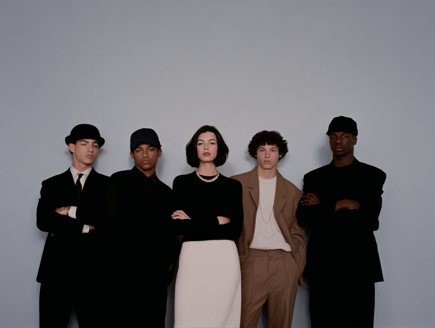 A group of five individuals in stylish, modern attire poses confidently against a plain background, showcasing unity and elegance.