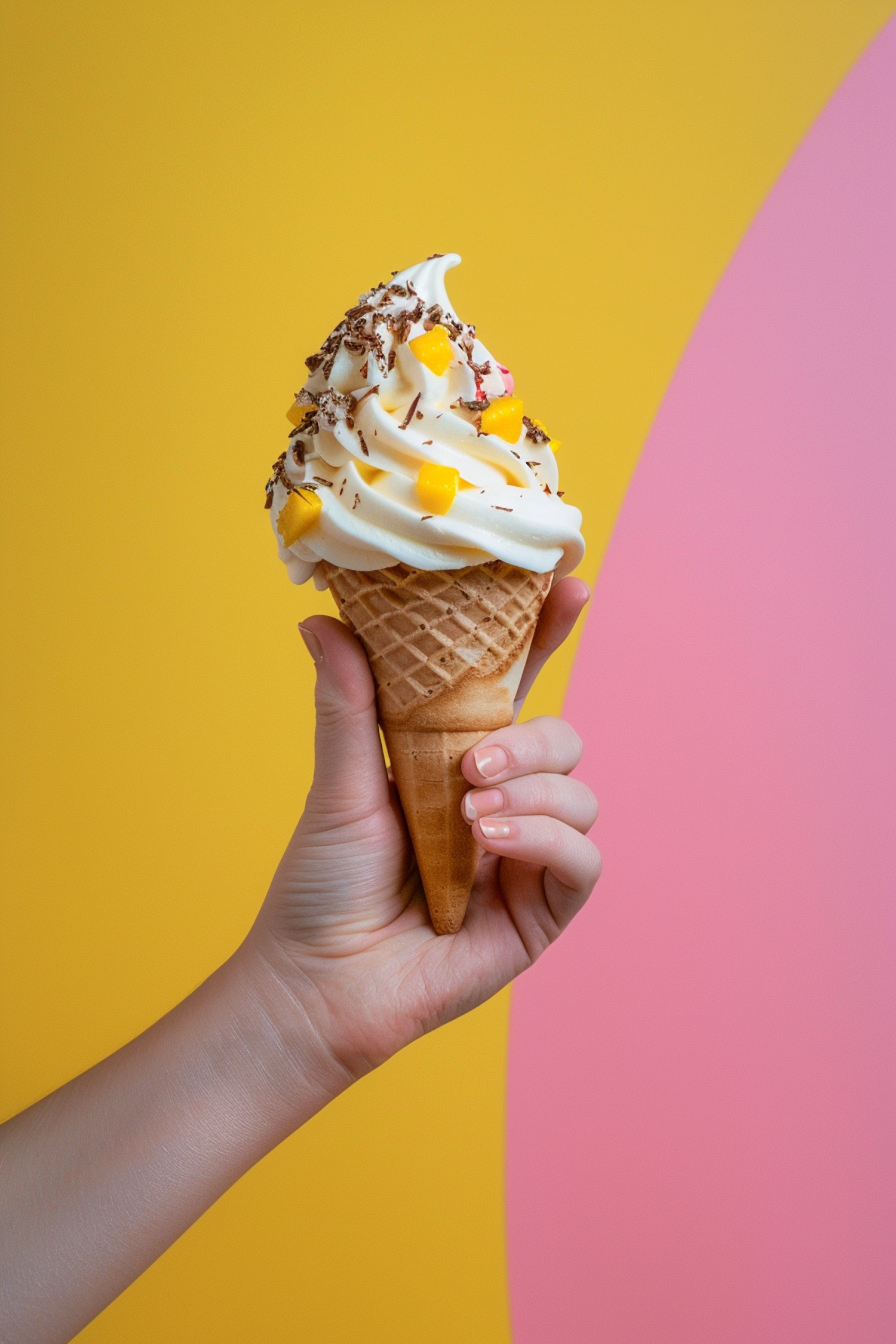 Hand holding a soft serve ice cream with mango and chocolate toppings against a vibrant yellow and pink background.