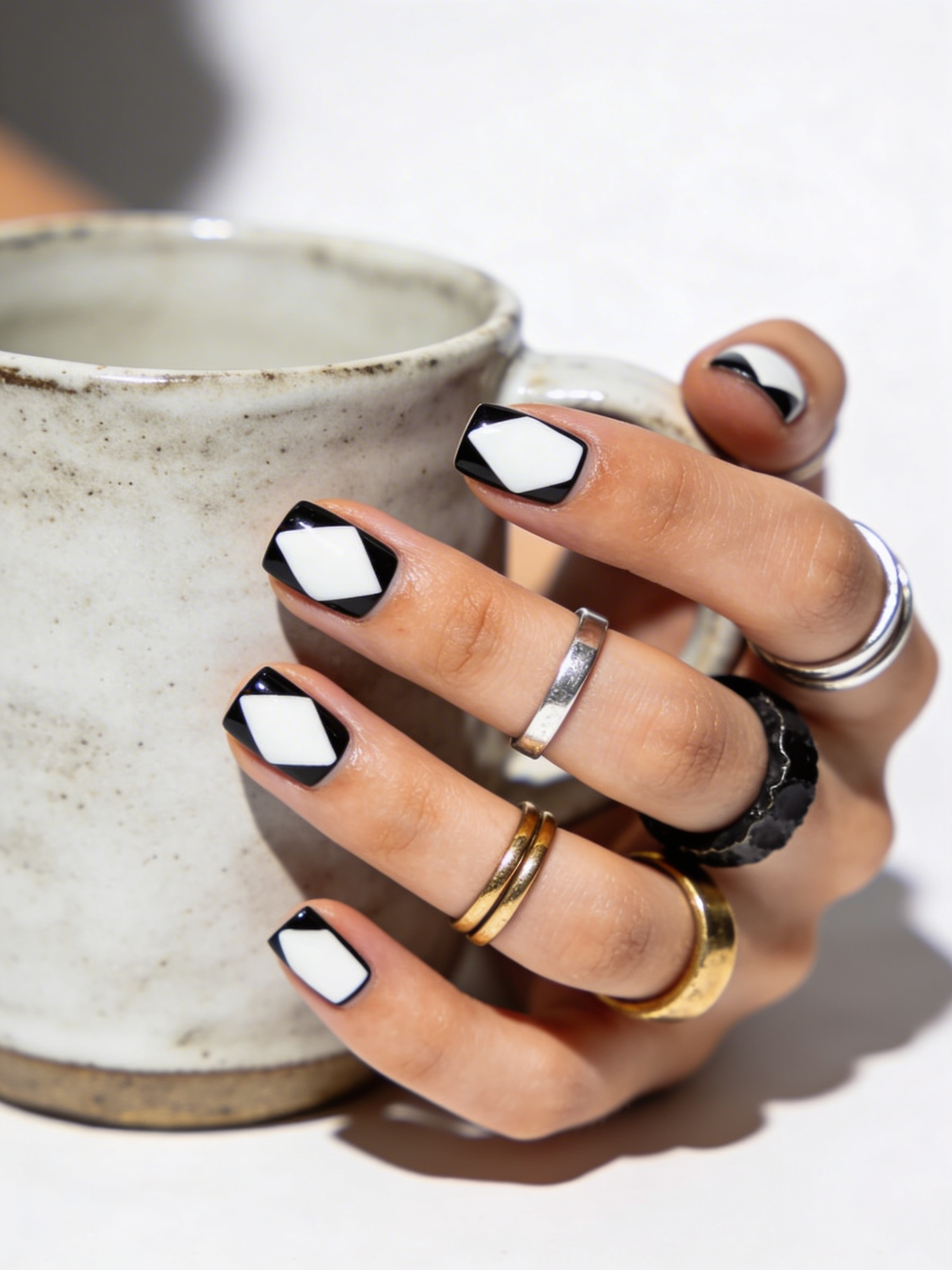 Short square nails painted in black-and-white geometric patterns hold a hand-thrown ceramic mug. Mixed metal rings—silver, brass, and oxidised black—add an artsy, modern aesthetic. The lighting is crisp, like a studio morning.