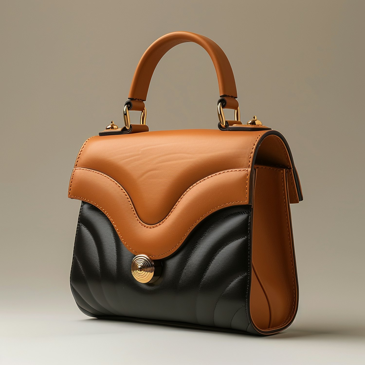 Elegant handbag with tan and black leather, gold hardware, and a unique wavy design. Perfect for a chic and sophisticated look.