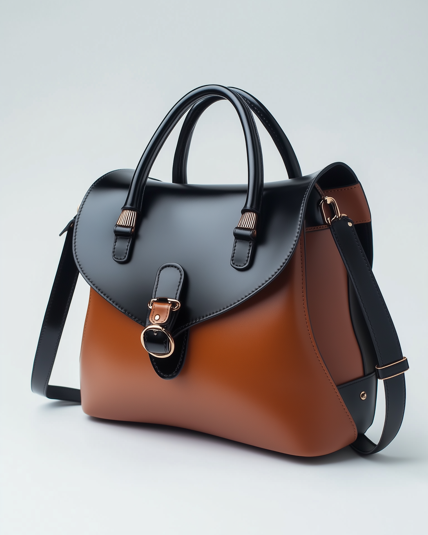 Elegant black and brown leather handbag with gold buckle and detachable strap, perfect for versatile style and functionality.