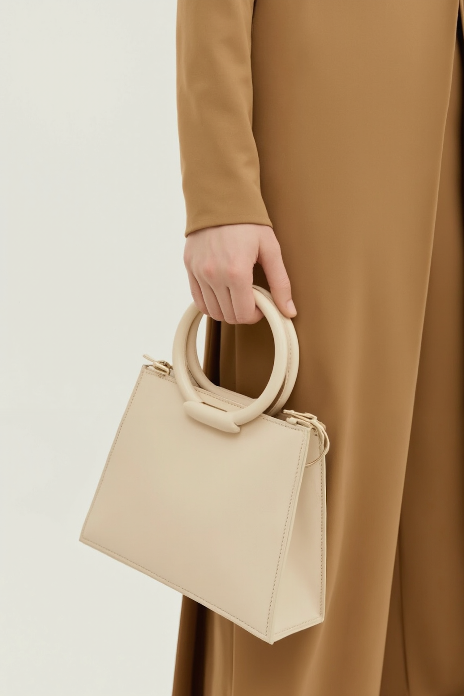 Close-up of a hand holding a beige handbag with a circular handle, paired with a camel-colored outfit in a minimalist setting.