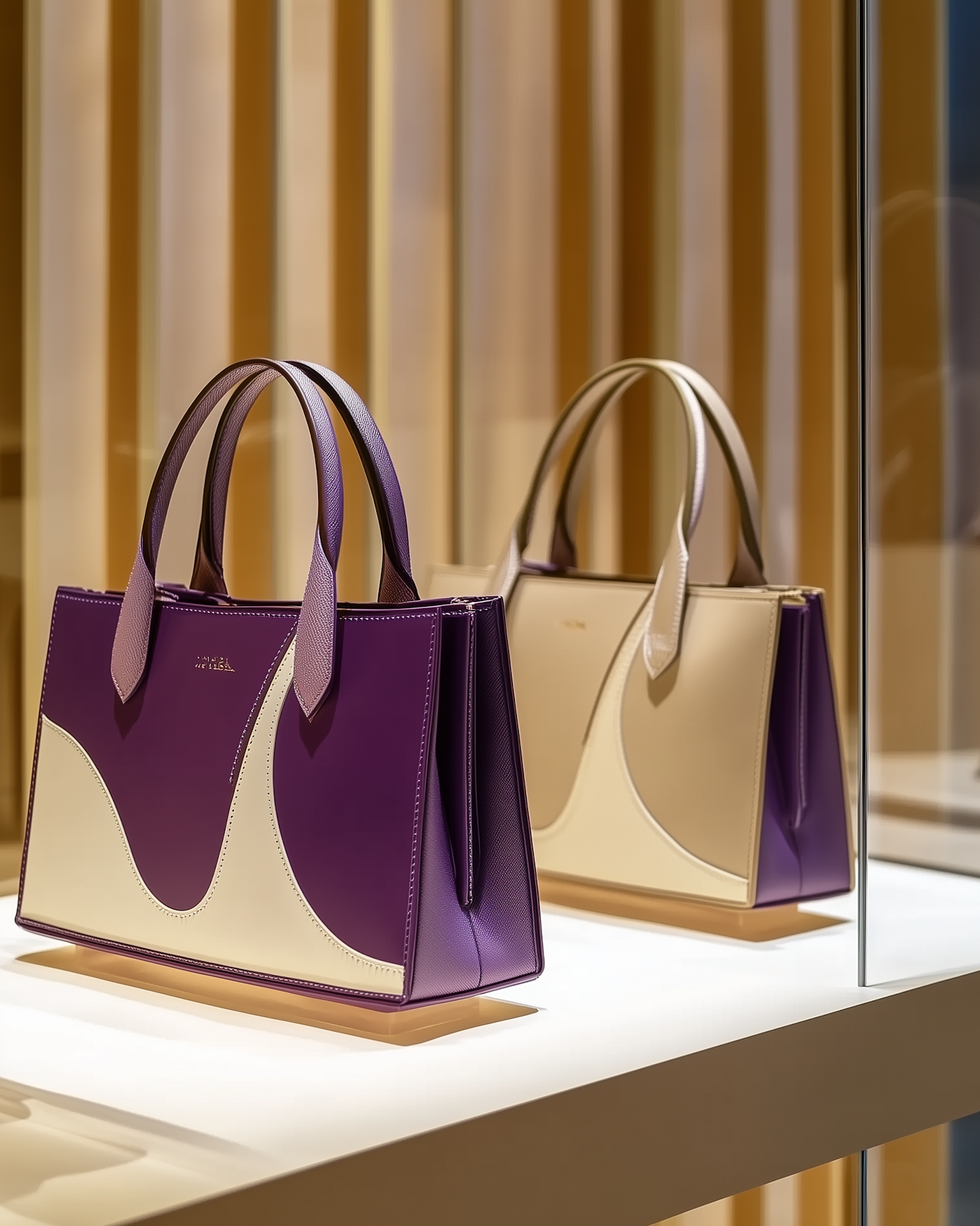 Elegant purple and cream handbag with wave design, gold branding, and leather finish displayed on a chic shelf with mirrored reflection.