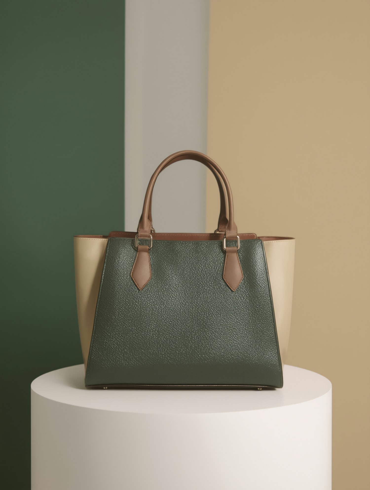 Elegant two-tone handbag with green and beige panels, brown leather handles, and a textured finish, displayed on a white pedestal.
