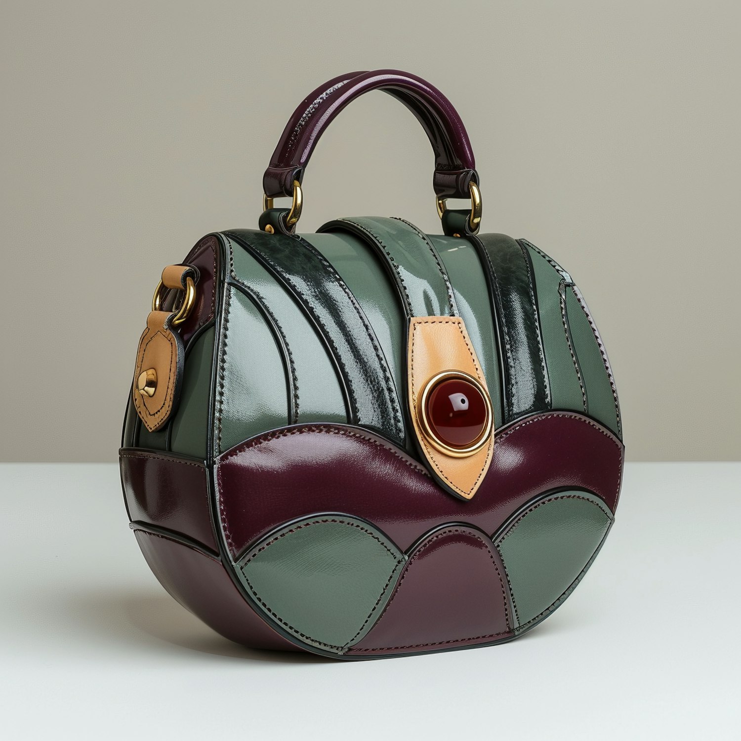Elegant handbag with glossy green and burgundy leather, gold hardware, and a unique round shape. Perfect for a chic fashion statement.