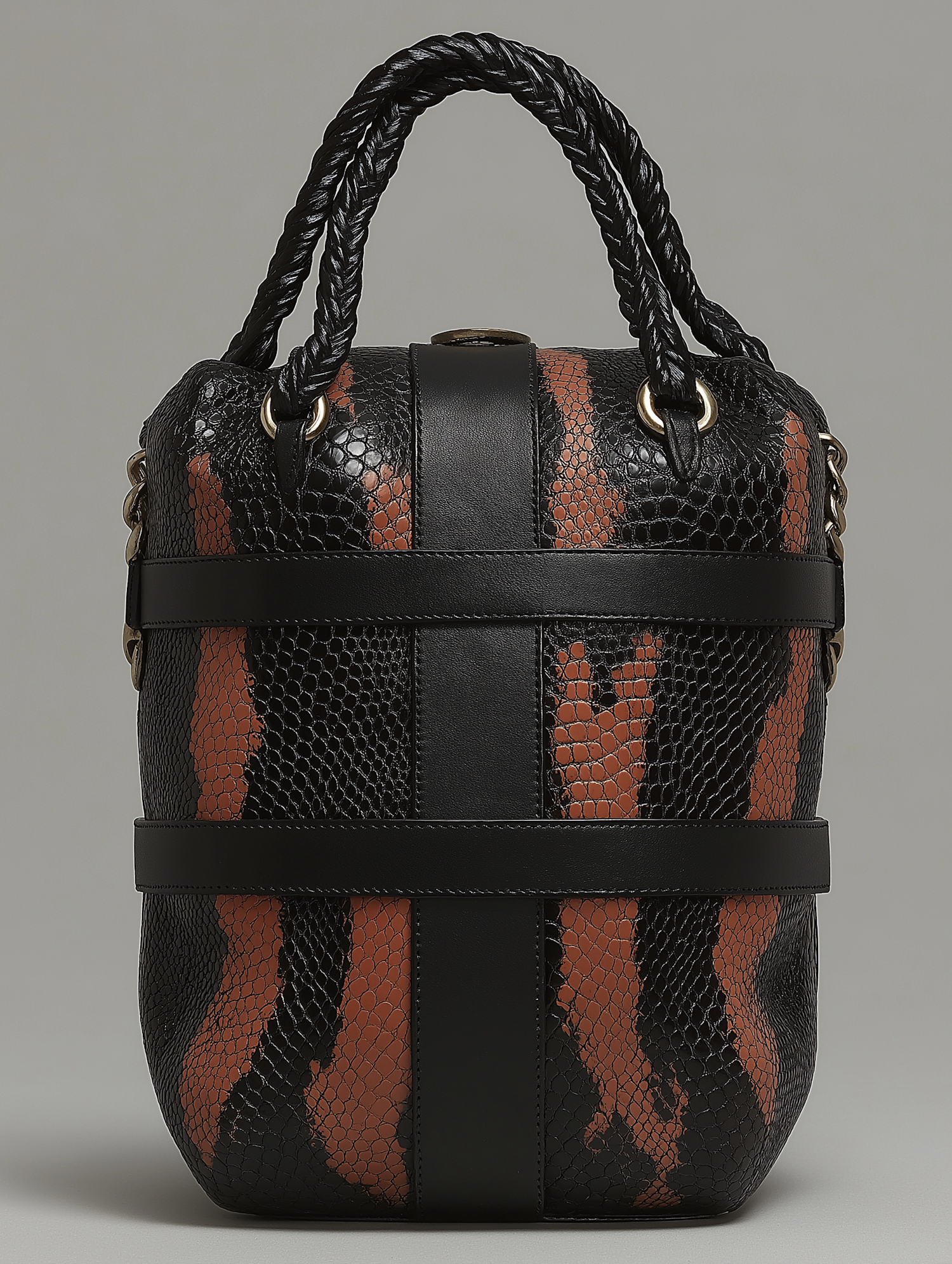 Chic handbag with snake-skin texture, black and orange stripes, braided handles, and leather straps. Perfect for a modern, stylish look.