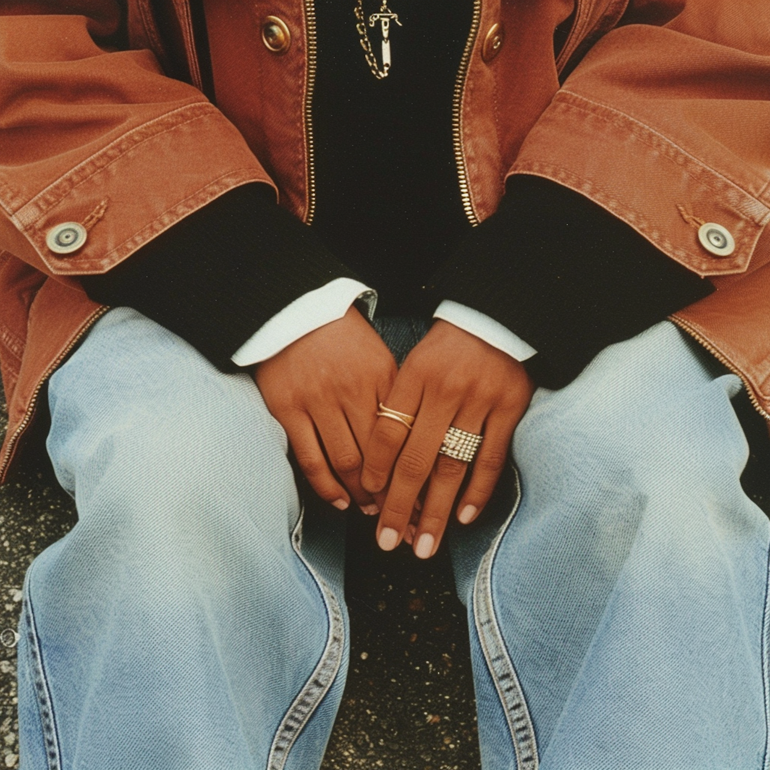Close-up of hands adorned with rings, wearing a brown jacket, black sweater, and light blue jeans, showcasing casual style.