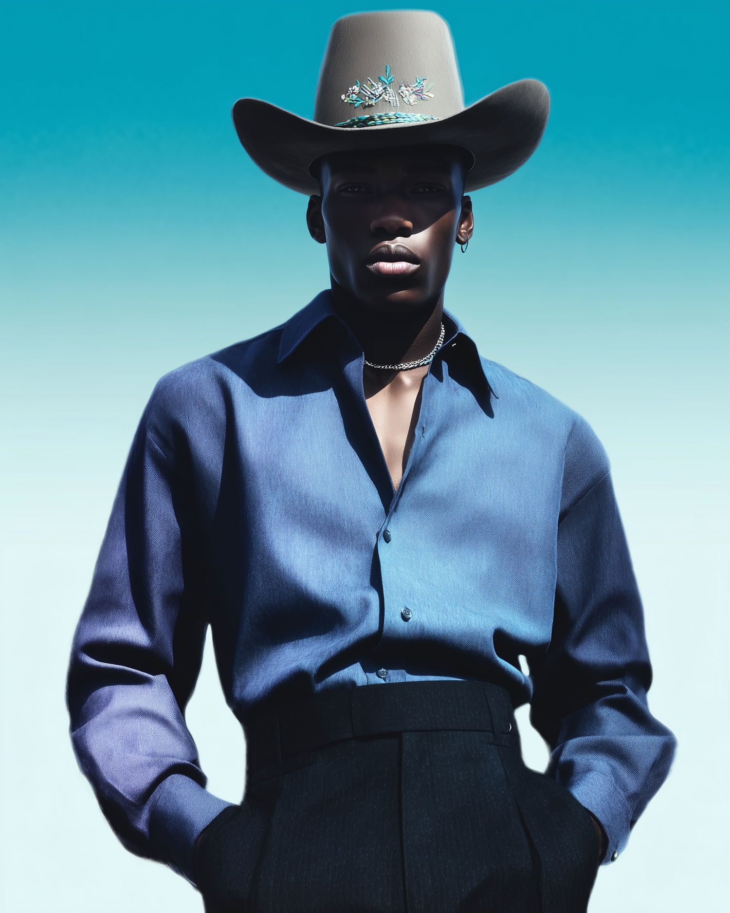 A fashionable person in a blue shirt and embroidered hat poses confidently against a gradient blue background.