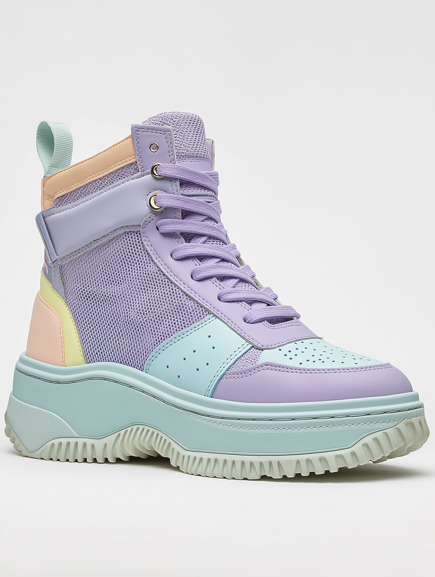 Trendy high-top sneaker in pastel lavender, aqua, and peach with a rugged mint green sole. Perfect for a stylish, modern look.