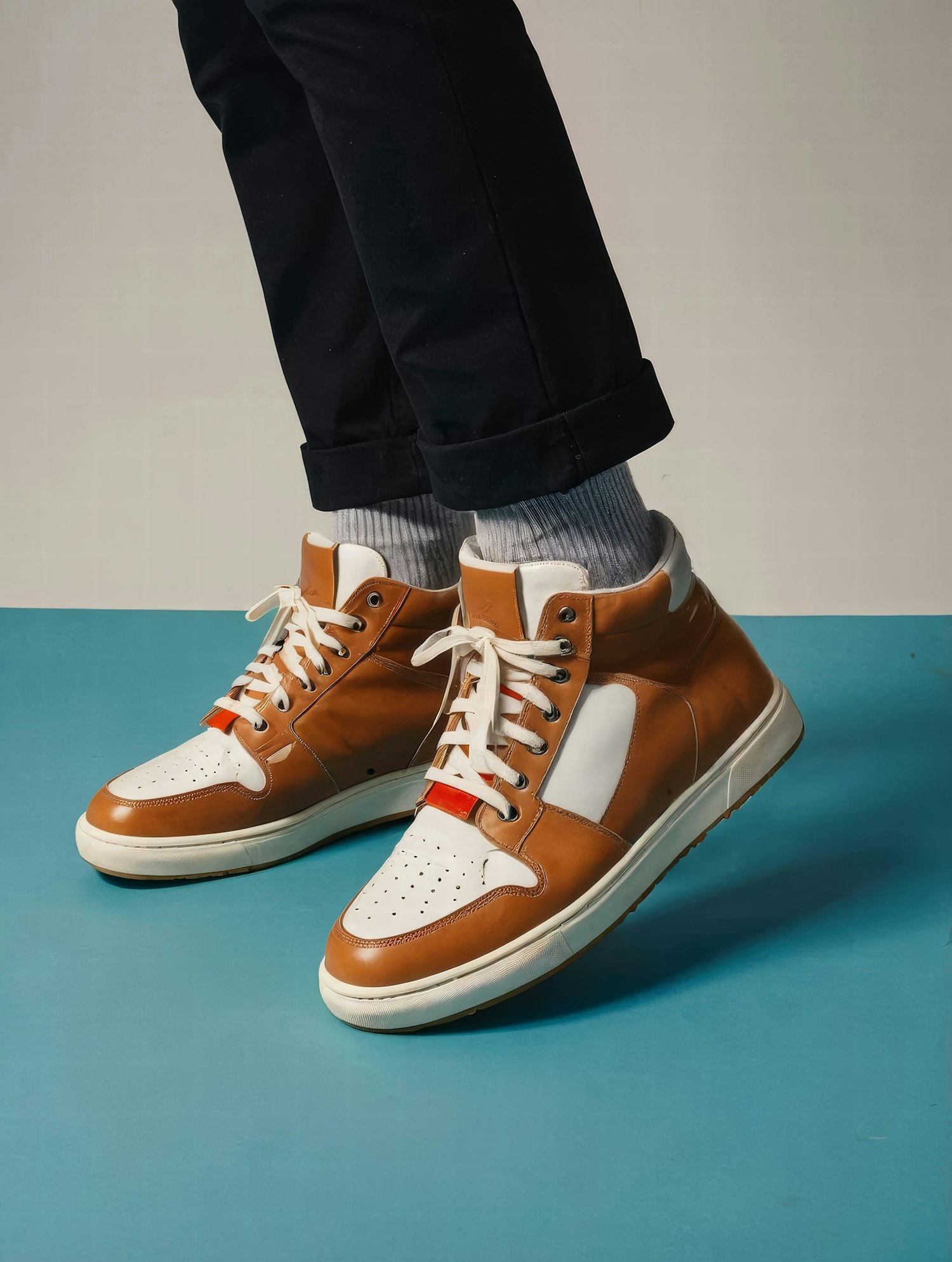 Trendy brown and white high-top sneakers with red accents, worn with black pants and gray socks on a blue floor.
