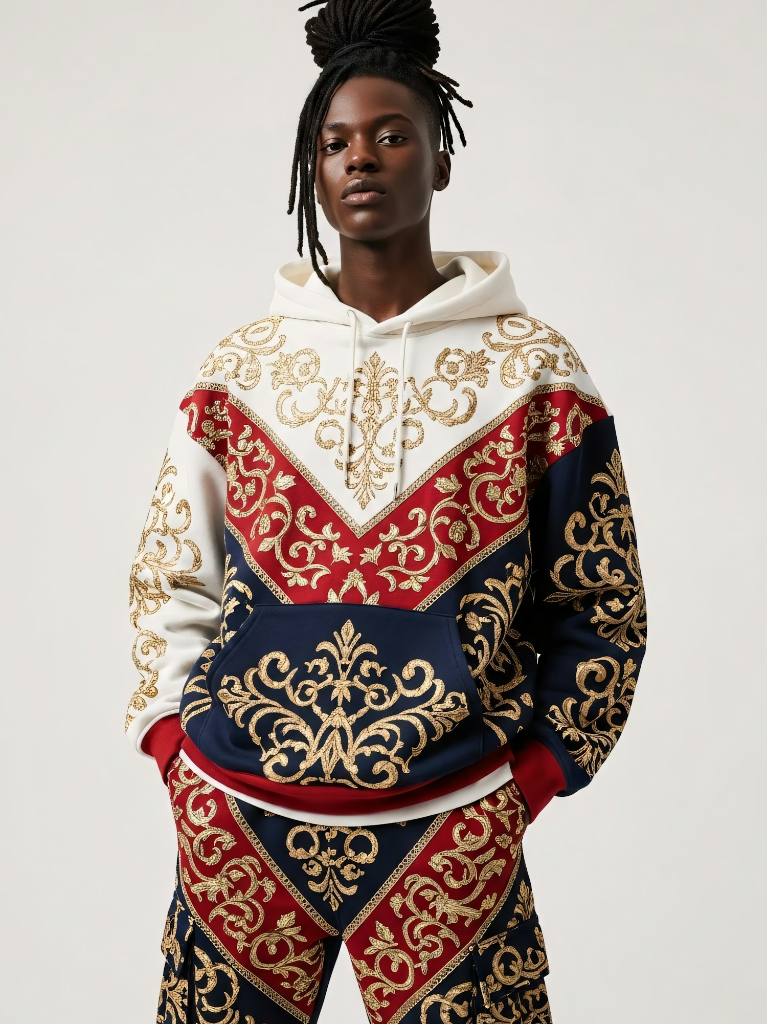 Stylish individual in a gold-patterned red, white, and navy hoodie and pants, showcasing bold and intricate fashion.