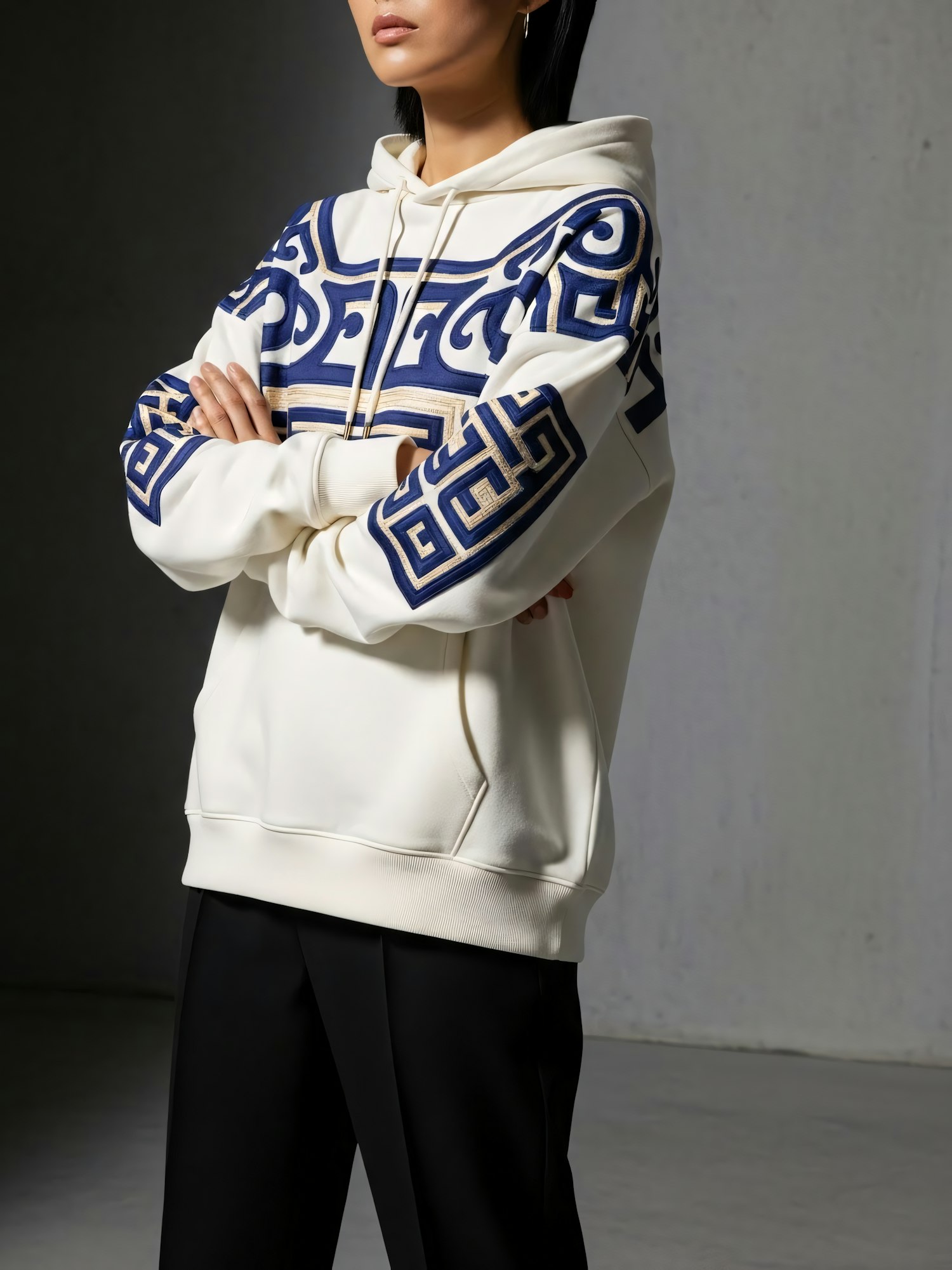Stylish white hoodie with blue and gold geometric patterns, paired with black trousers, worn by a confident individual in a minimalistic setting.