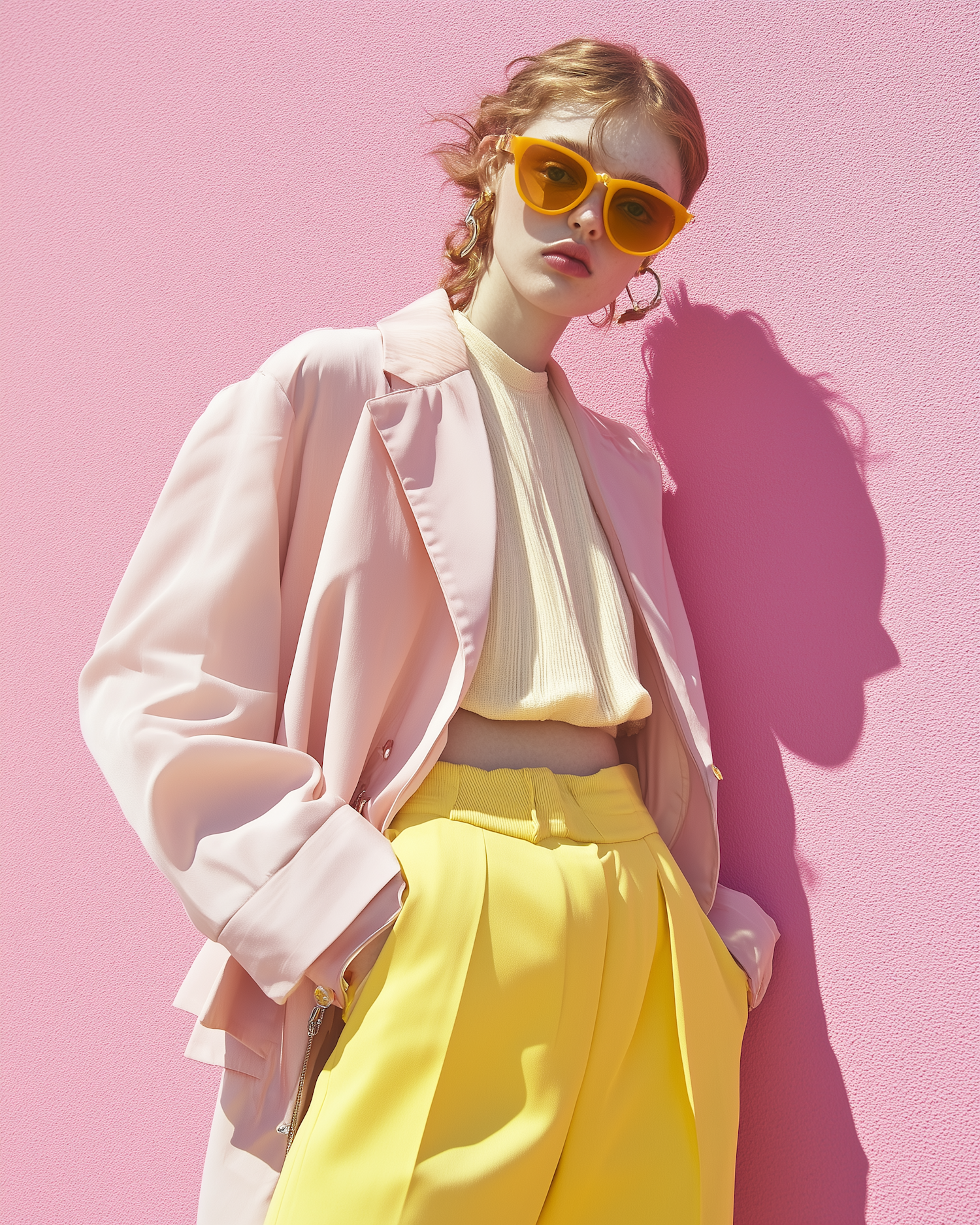 Stylish woman in pink and yellow outfit with orange sunglasses against a pink wall, exuding confidence and vibrant fashion.