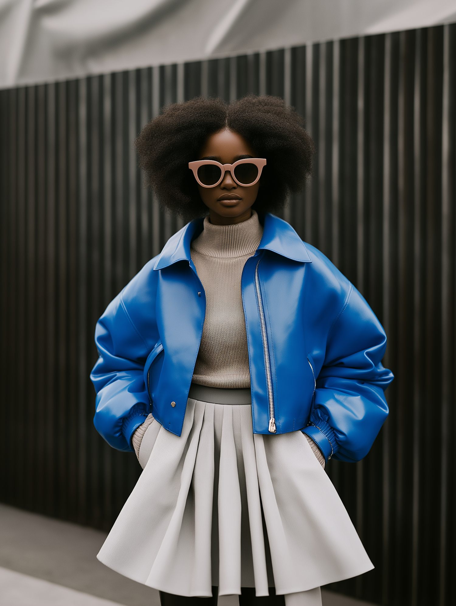 Stylish woman in blue leather jacket and pink sunglasses, with afro hairstyle, stands against modern dark panel background.