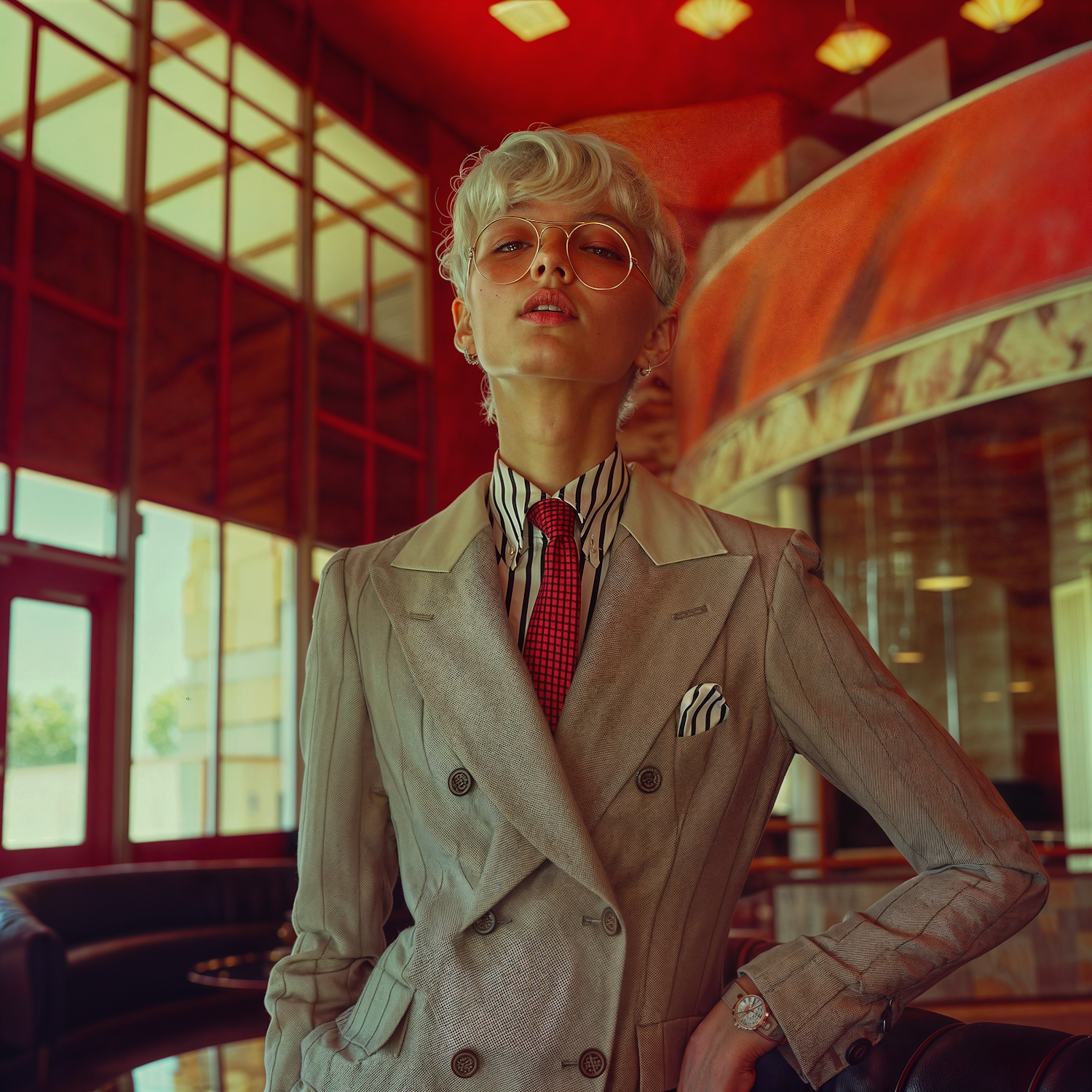 Stylish person in a beige suit with red tie and glasses, set in a modern, red-toned interior with large windows.