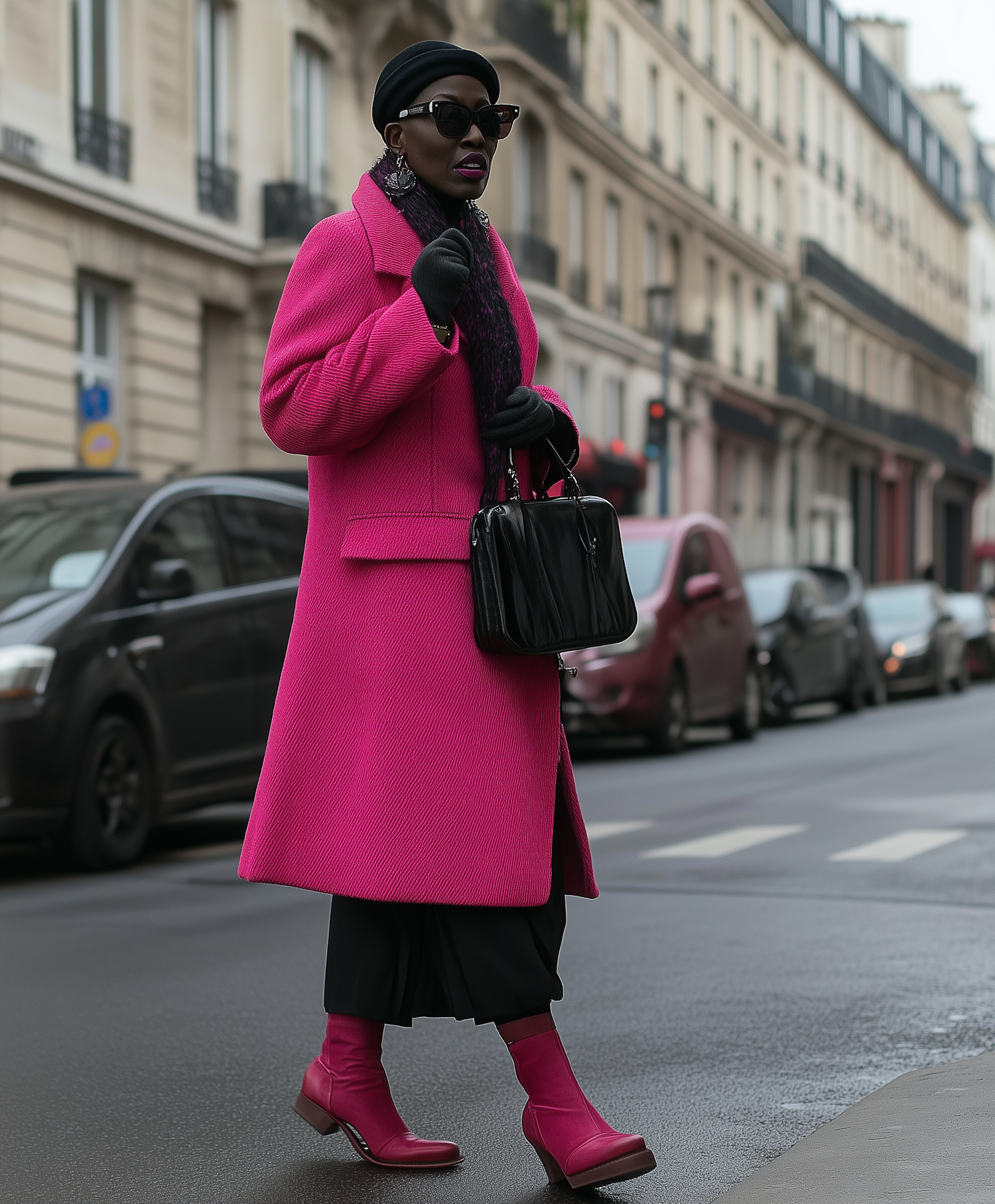 Chic urban fashion: Black woman in vibrant pink coat and boots, accessorized with sunglasses and a beanie, walking in a city street.