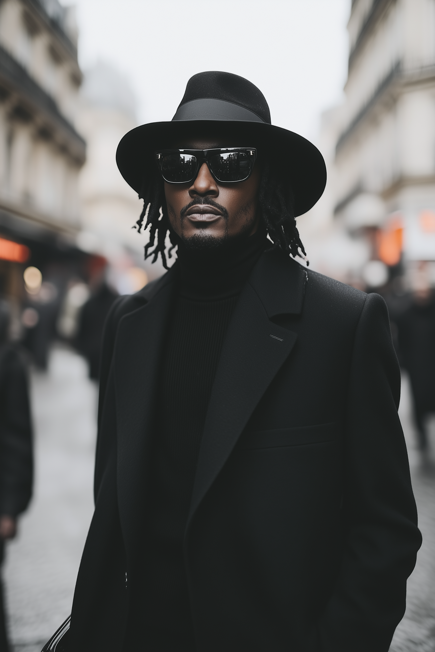 Stylish man in black fedora and sunglasses on a city street, exuding confidence and sophistication.