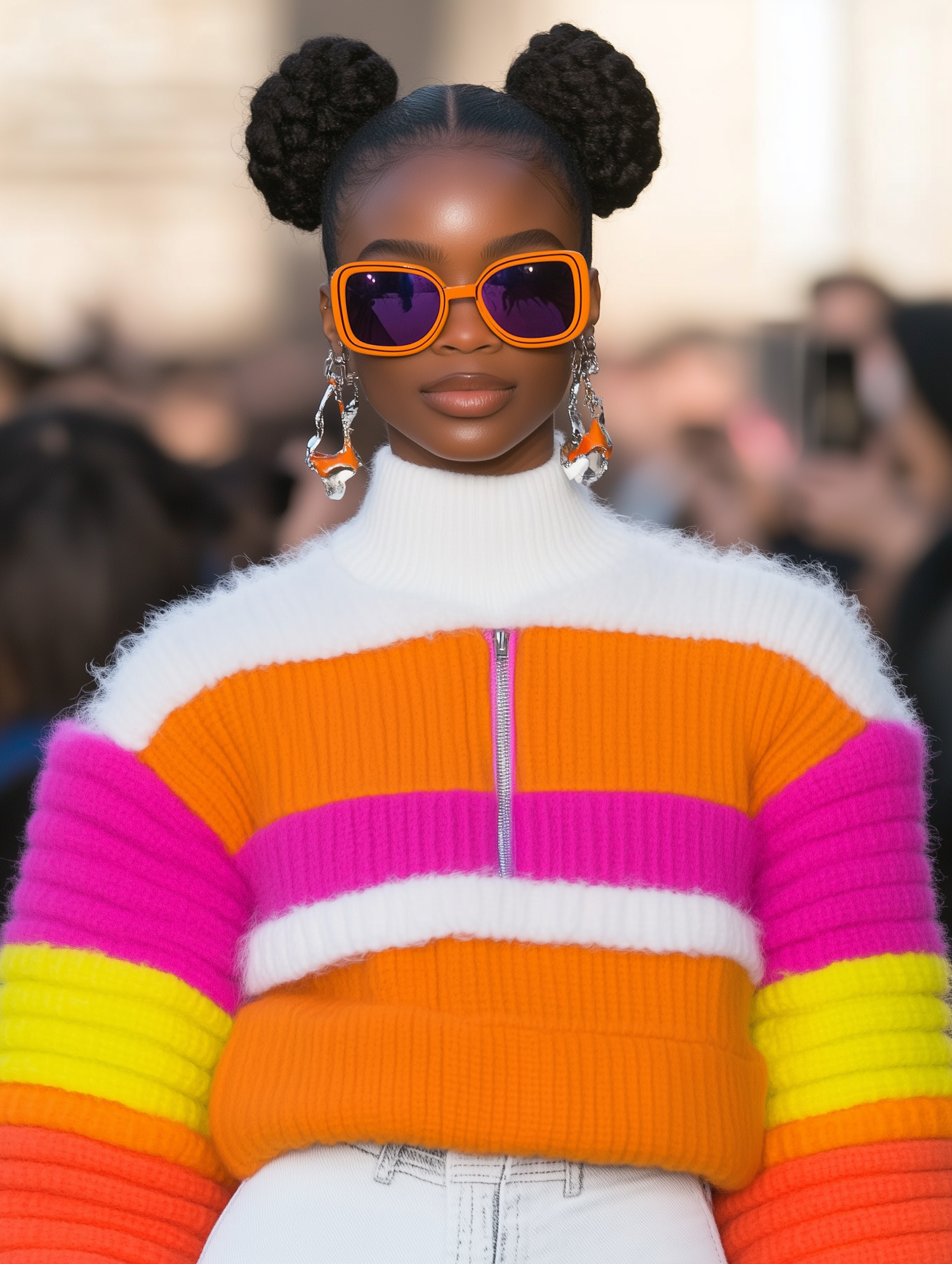 Fashion-forward woman in a colorful striped sweater, orange sunglasses, and bold earrings, exuding confidence and style outdoors.