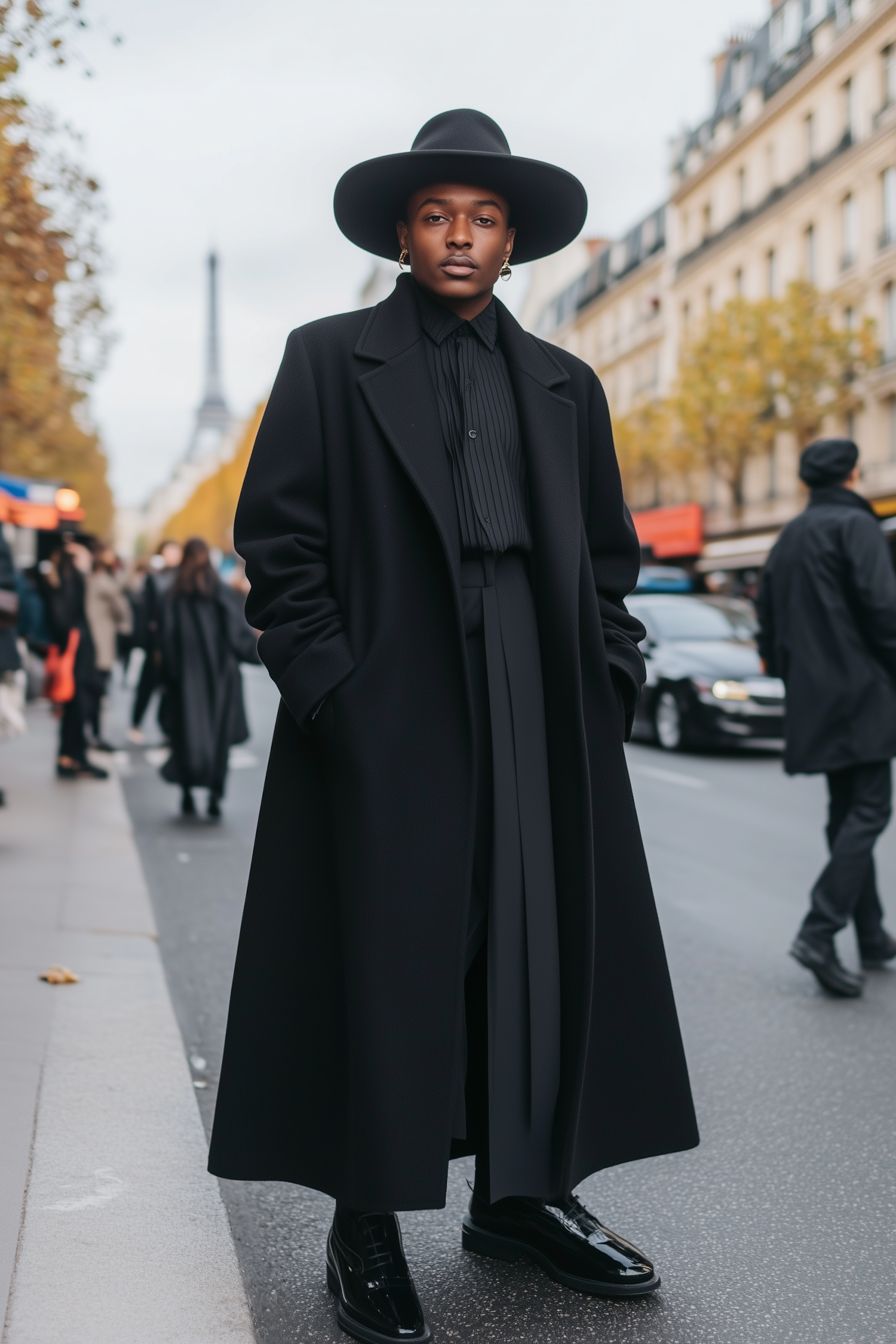 Stylish man in black coat and hat on Paris street with Eiffel Tower in background, exuding elegance and sophistication.