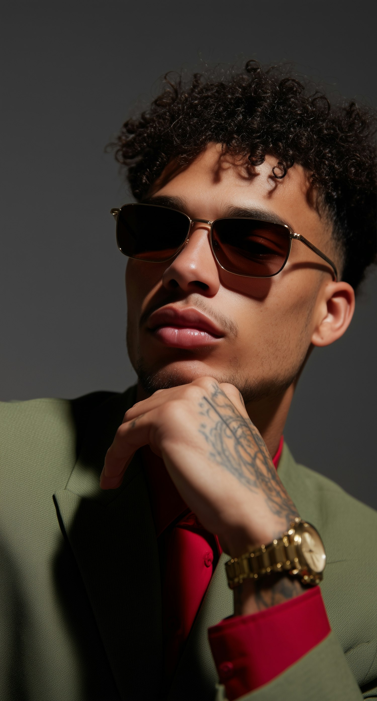 Stylish individual in sunglasses, green blazer, and red shirt, accessorized with a gold watch, posing confidently against a neutral background.