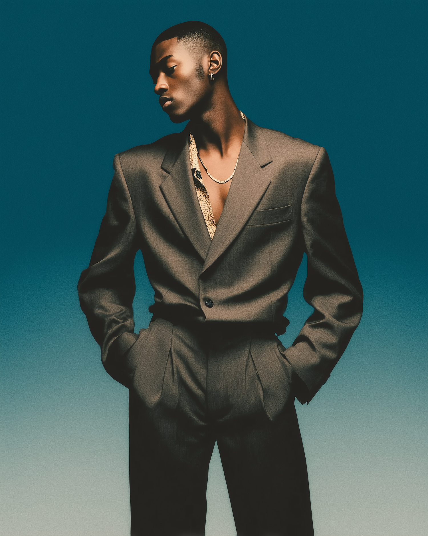 A person in a tailored suit with a gold chain stands against a teal gradient background, exuding modern style and elegance.